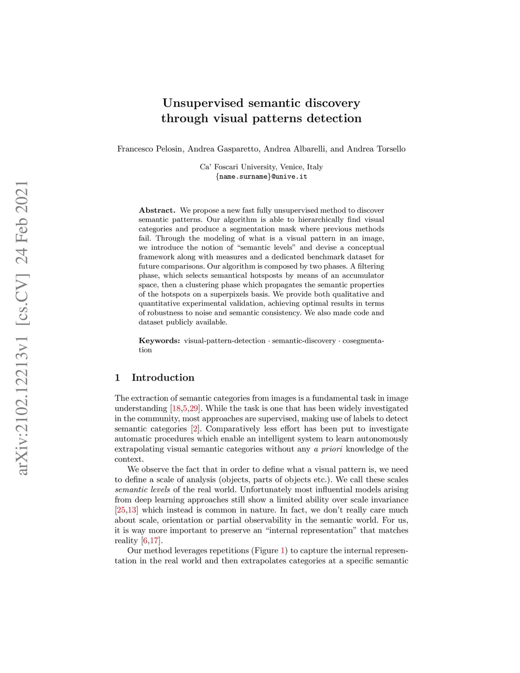 Unsupervised semantic discovery through visual patterns detection