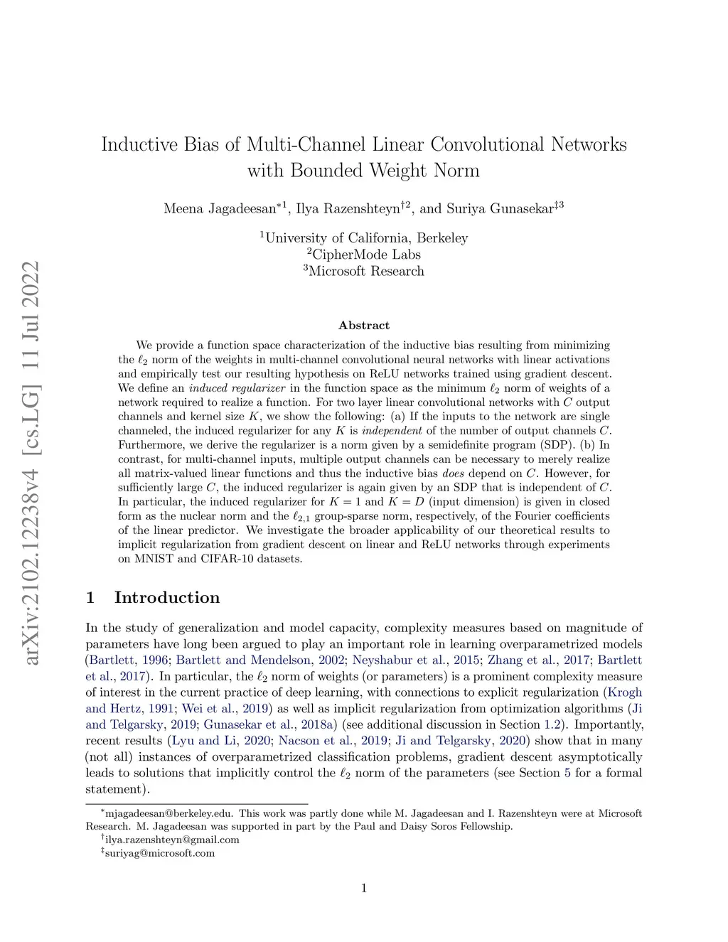 We provide a function space characterization of the inductive bias resulting from minimizing the norm of the weights in multi-channel convolutional neural networks with linear activations and empirically test our resulting hypothesis on ReLU networks trained using gradient descent. We define an induced regularizer in the function space as the minimum norm of weights of a network required to realize a function. For two layer linear convolutional networks with output channels and kernel size , we show the following: (a) If the inputs to the network are single channeled, the induced regularizer for any is independent of the number of output channels . Furthermore, we derive the regularizer is a norm given by a semidefinite program (SDP). (b) In contrast, for multi-channel inputs, multiple output channels can be necessary to merely realize all matrix-valued linear functions and thus the inductive bias does depend on . However, for sufficiently large , the induced regularizer is again given by an SDP that is independent of . In particular, the induced regularizer for and (input dimension) is given in closed form as the nuclear norm and the group-sparse norm, respectively, of the Fourier coefficients of the linear predictor. We investigate the broader applicability of our theoretical results to implicit regularization from gradient descent on linear and ReLU networks through experiments on MNIST and CIFAR-10 datasets.