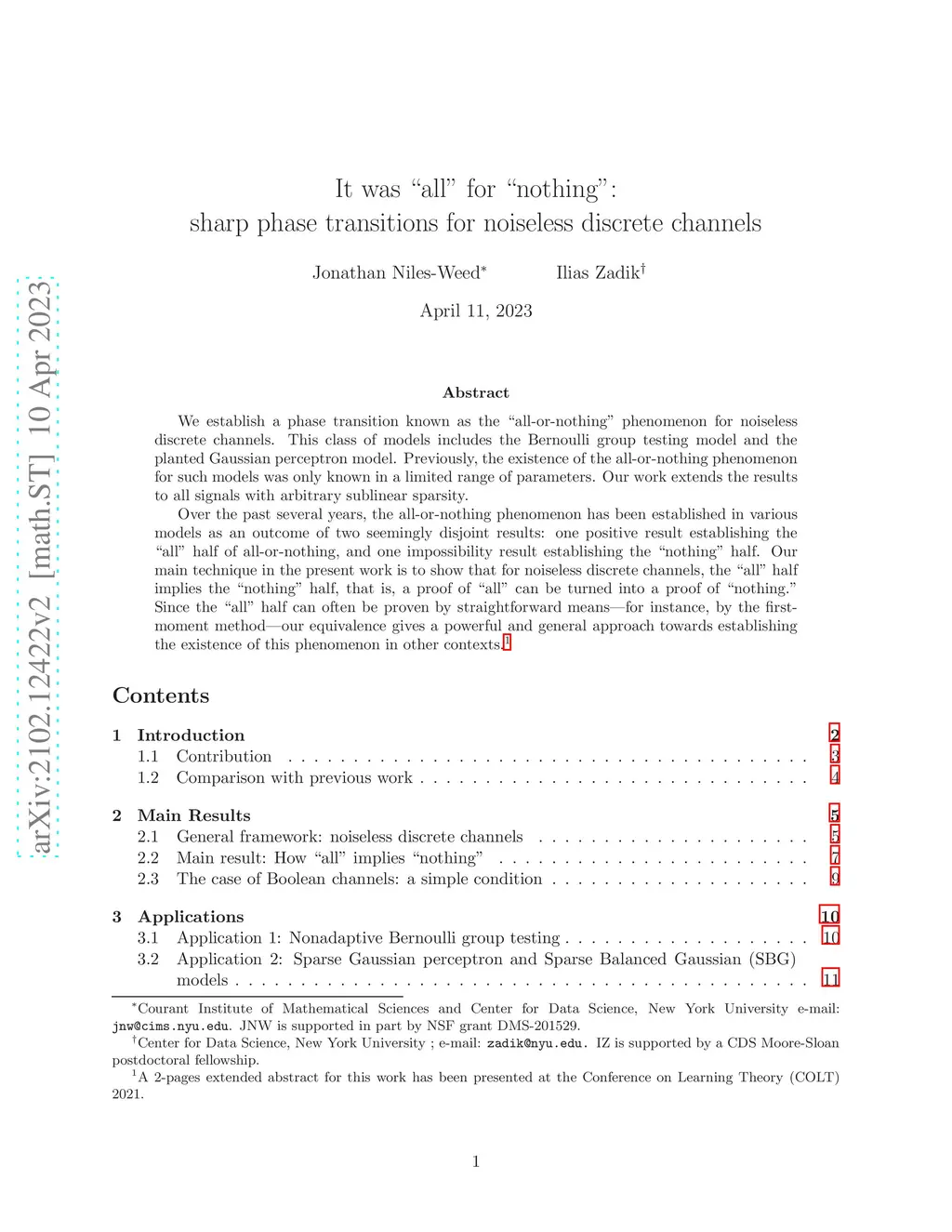 We establish a phase transition known as the "all-or-nothing" phenomenon for noiseless discrete channels. This class of models includes the Bernoulli group testing model and the planted Gaussian perceptron model. Previously, the existence of the all-or-nothing phenomenon for such models was only known in a limited range of parameters. Our work extends the results to all signals with arbitrary sublinear sparsity. Over the past several years, the all-or-nothing phenomenon has been established in various models as an outcome of two seemingly disjoint results: one positive result establishing the "all" half of all-or-nothing, and one impossibility result establishing the "nothing" half. Our main technique in the present work is to show that for noiseless discrete channels, the "all" half implies the "nothing" half, that is a proof of "all" can be turned into a proof of "nothing." Since the "all" half can often be proven by straightforward means -- for instance, by the first-moment method -- our equivalence gives a powerful and general approach towards establishing the existence of this phenomenon in other contexts.