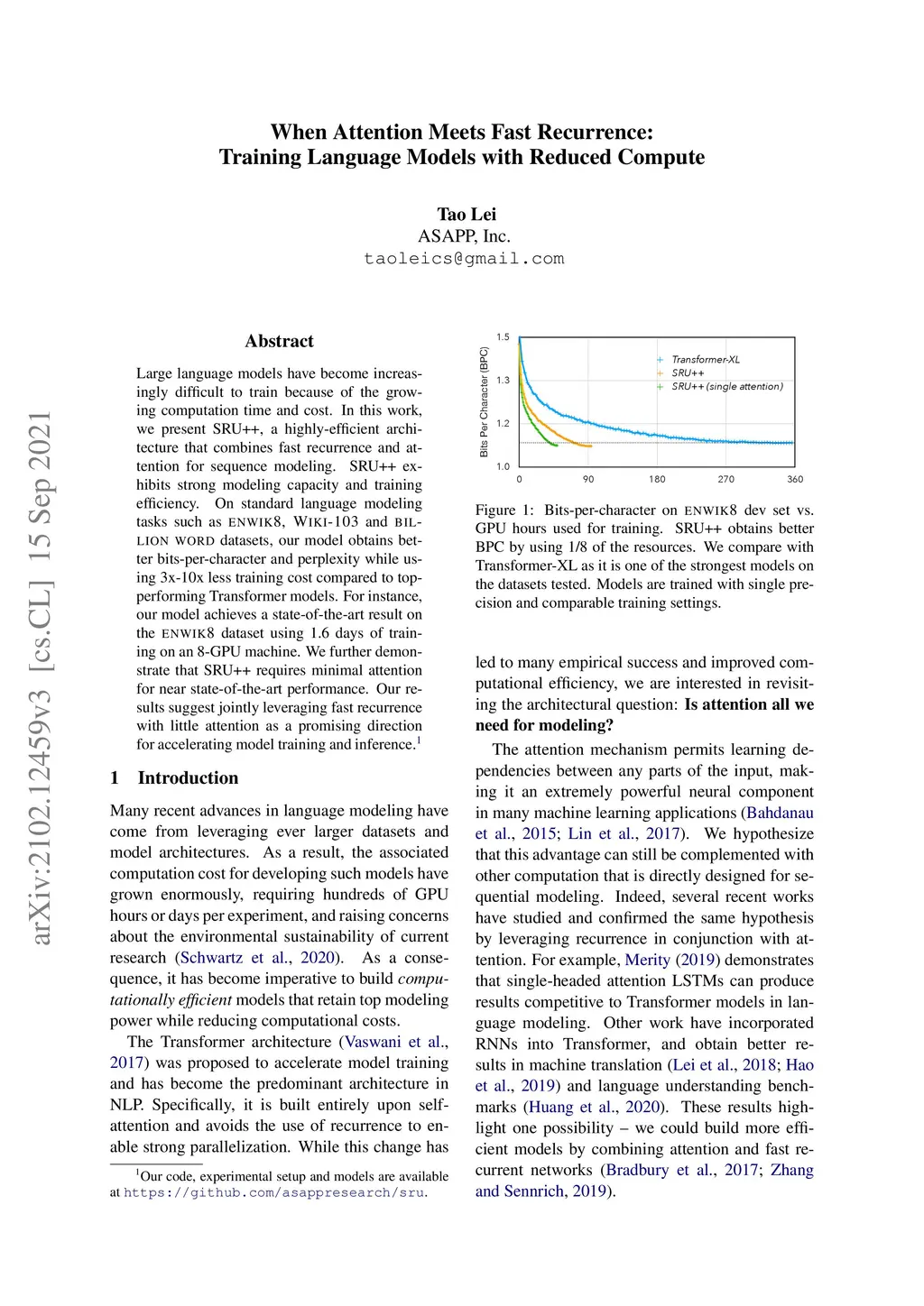Large language models have become increasingly difficult to train because of the required computation time and cost. In this work, we present SRU++, a recurrent unit with optional built-in attention that exhibits state-of-the-art modeling capacity and training efficiency. On standard language modeling benchmarks such as enwik8 and Wiki-103 datasets, our model obtains better perplexity and bits-per-character (bpc) while using 2.5x-10x less training time and cost compared to top-performing Transformer models. Our results reaffirm that attention is not all we need and can be complementary to other sequential modeling modules. Moreover, fast recurrence with little attention can be a leading model architecture.