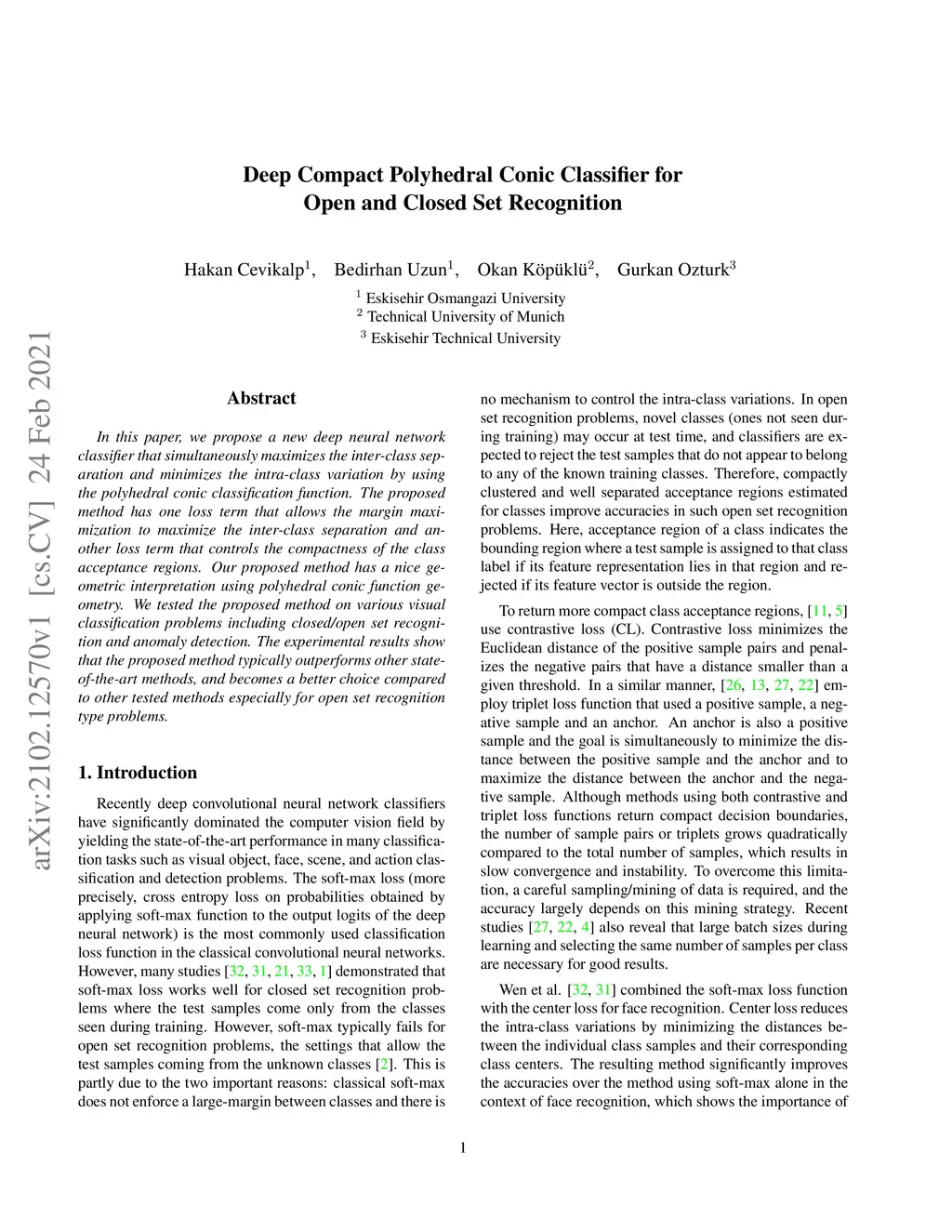 In this paper, we propose a new deep neural network classifier that simultaneously maximizes the inter-class separation and minimizes the intra-class variation by using the polyhedral conic classification function. The proposed method has one loss term that allows the margin maximization to maximize the inter-class separation and another loss term that controls the compactness of the class acceptance regions. Our proposed method has a nice geometric interpretation using polyhedral conic function geometry. We tested the proposed method on various visual classification problems including closed/open set recognition and anomaly detection. The experimental results show that the proposed method typically outperforms other state-of-the art methods, and becomes a better choice compared to other tested methods especially for open set recognition type problems.