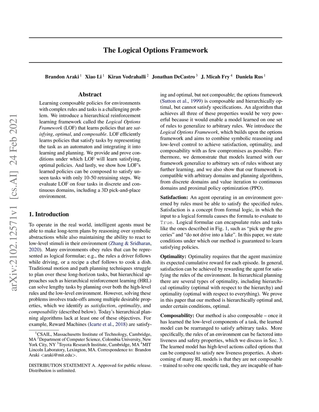 Learning composable policies for environments with complex rules and tasks is a challenging problem. We introduce a hierarchical reinforcement learning framework called the Logical Options Framework (LOF) that learns policies that are satisfying, optimal, and composable. LOF efficiently learns policies that satisfy tasks by representing the task as an automaton and integrating it into learning and planning. We provide and prove conditions under which LOF will learn satisfying, optimal policies. And lastly, we show how LOF's learned policies can be composed to satisfy unseen tasks with only 10-50 retraining steps. We evaluate LOF on four tasks in discrete and continuous domains, including a 3D pick-and-place environment.