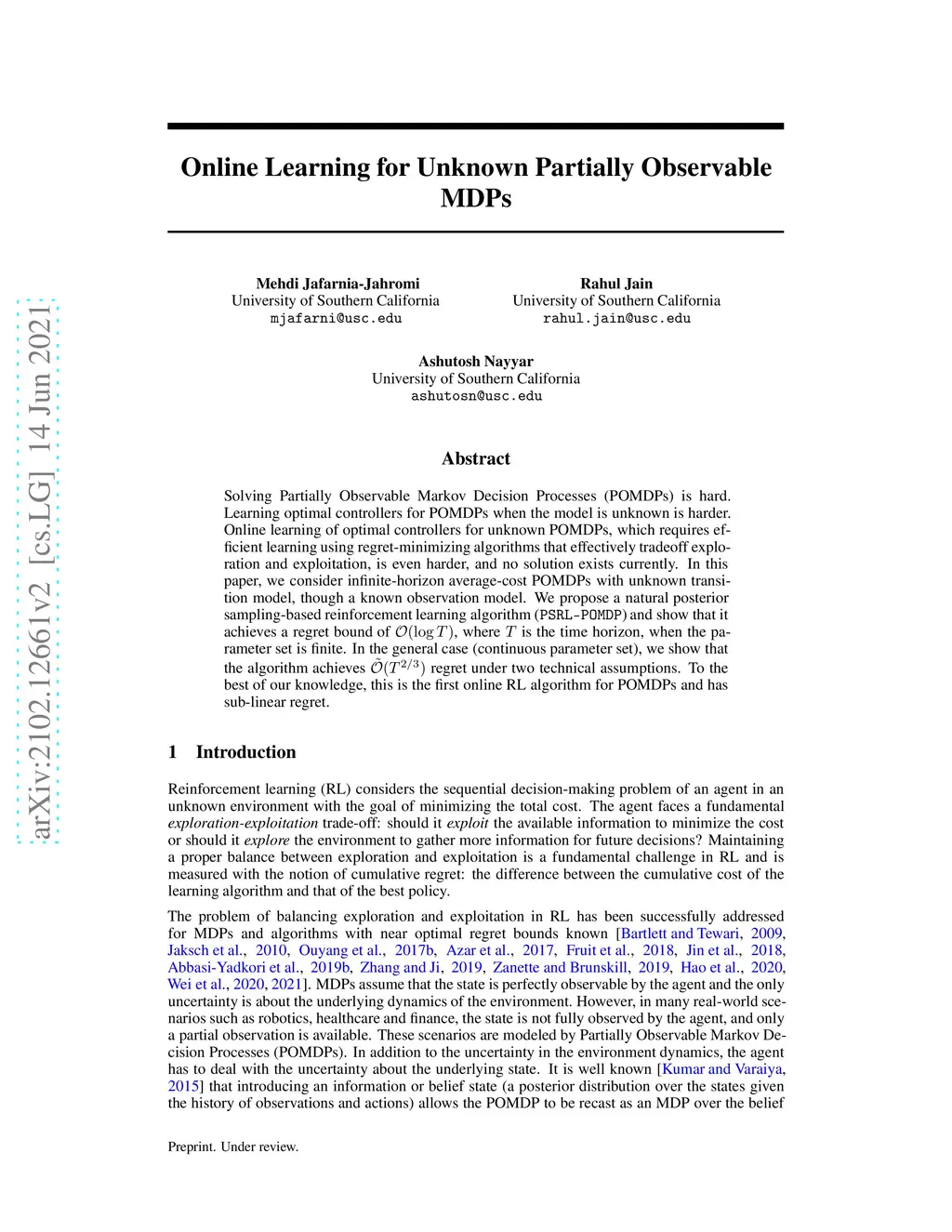 Online Learning for Unknown Partially Observable MDPs
