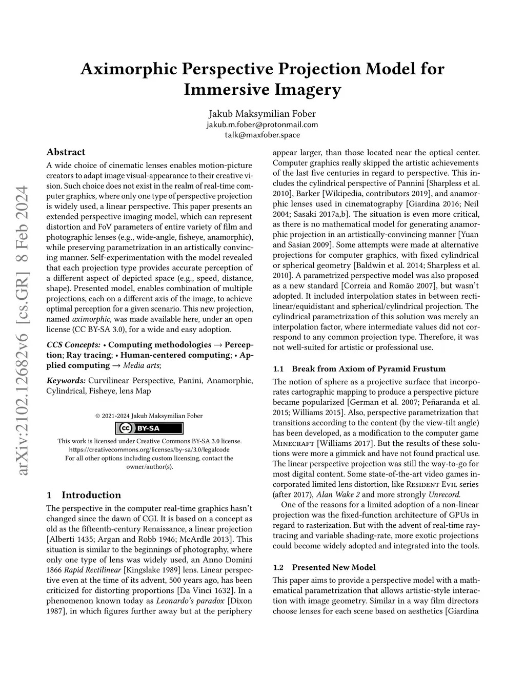 A wide choice of cinematic lenses enables motion-picture creators to adapt image visual-appearance to their creative vision. Such choice does not exist in the realm of real-time computer graphics, where only one type of perspective projection is widely used, a linear perspective. This paper presents an extended perspective imaging model, which can represent distortion and FoV parameters of entire variety of film and photographic lenses (e.g., wide-angle, fisheye, anamorphic), while preserving parametrization in an artistically convincing manner. Self-experimentation with the model revealed that each projection type provides accurate perception of a different aspect of depicted space (e.g., speed, distance, shape). Presented model, enables combination of multiple projections, each on a different axis of the image, to achieve optimal perception for a given scenario. This new projection, named aximorphic, was made available here, under an open license (CC BY-SA 3.0), for a wide and easy adoption.