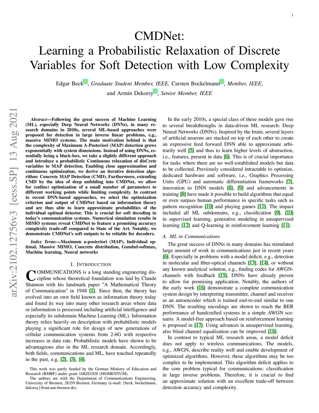 Following the great success of Machine Learning (ML), especially Deep Neural Networks (DNNs), in many research domains in 2010s, several ML-based approaches were proposed for detection in large inverse linear problems, e.g., massive MIMO systems. The main motivation behind is that the complexity of Maximum A-Posteriori (MAP) detection grows exponentially with system dimensions. Instead of using DNNs, essentially being a black-box, we take a slightly different approach and introduce a probabilistic Continuous relaxation of disCrete variables to MAP detection. Enabling close approximation and continuous optimization, we derive an iterative detection algorithm: Concrete MAP Detection (CMD). Furthermore, extending CMD by the idea of deep unfolding into CMDNet, we allow for (online) optimization of a small number of parameters to different working points while limiting complexity. In contrast to recent DNN-based approaches, we select the optimization criterion and output of CMDNet based on information theory and are thus able to learn approximate probabilities of the individual optimal detector. This is crucial for soft decoding in today's communication systems. Numerical simulation results in MIMO systems reveal CMDNet to feature a promising accuracy complexity trade-off compared to State of the Art. Notably, we demonstrate CMDNet's soft outputs to be reliable for decoders.