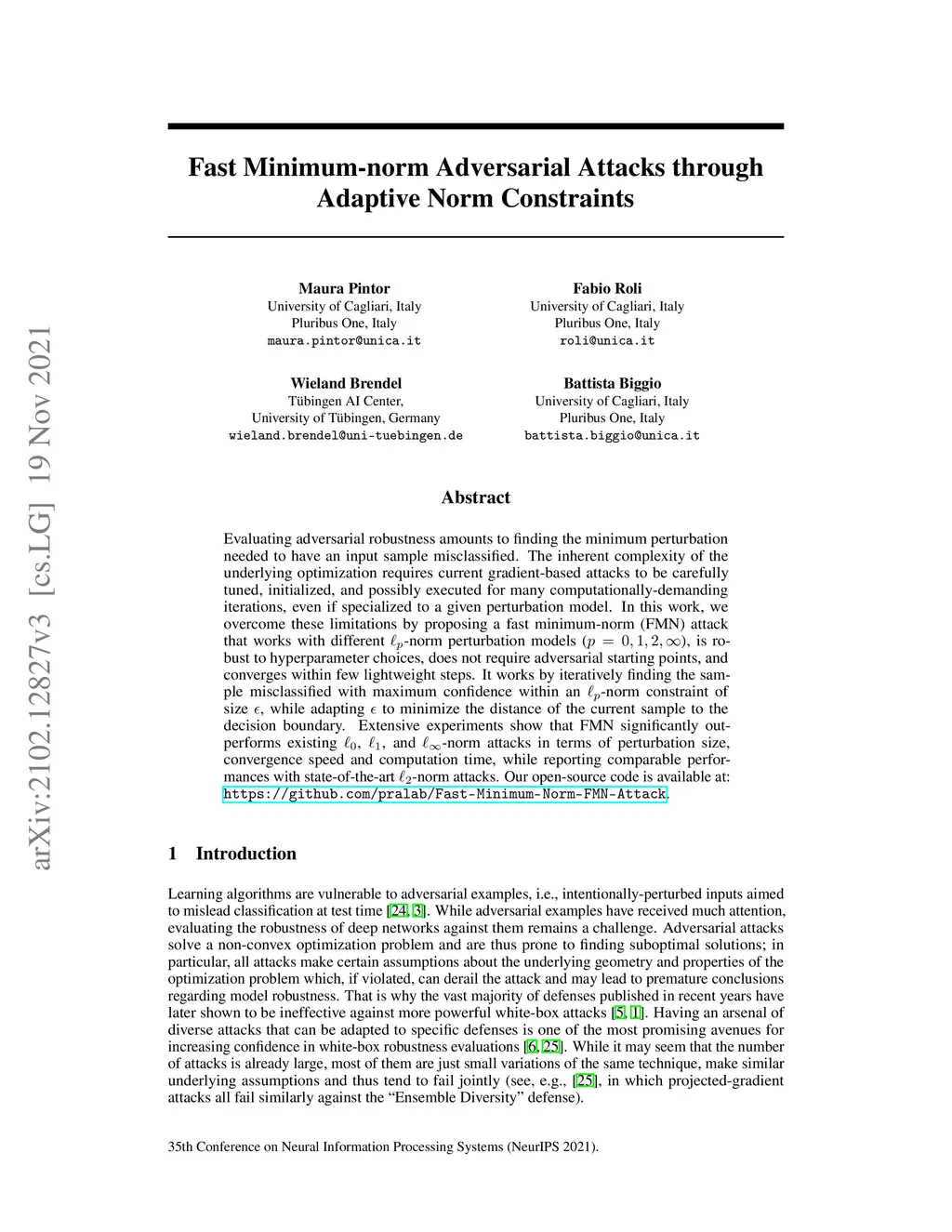Evaluating adversarial robustness amounts to finding the minimum perturbation needed to have an input sample misclassified. The inherent complexity of the underlying optimization requires current gradient-based attacks to be carefully tuned, initialized, and possibly executed for many computationally-demanding iterations, even if specialized to a given perturbation model. In this work, we overcome these limitations by proposing a fast minimum-norm (FMN) attack that works with different -norm perturbation models (), is robust to hyperparameter choices, does not require adversarial starting points, and converges within few lightweight steps. It works by iteratively finding the sample misclassified with maximum confidence within an -norm constraint of size , while adapting to minimize the distance of the current sample to the decision boundary. Extensive experiments show that FMN significantly outperforms existing attacks in terms of convergence speed and computation time, while reporting comparable or even smaller perturbation sizes.