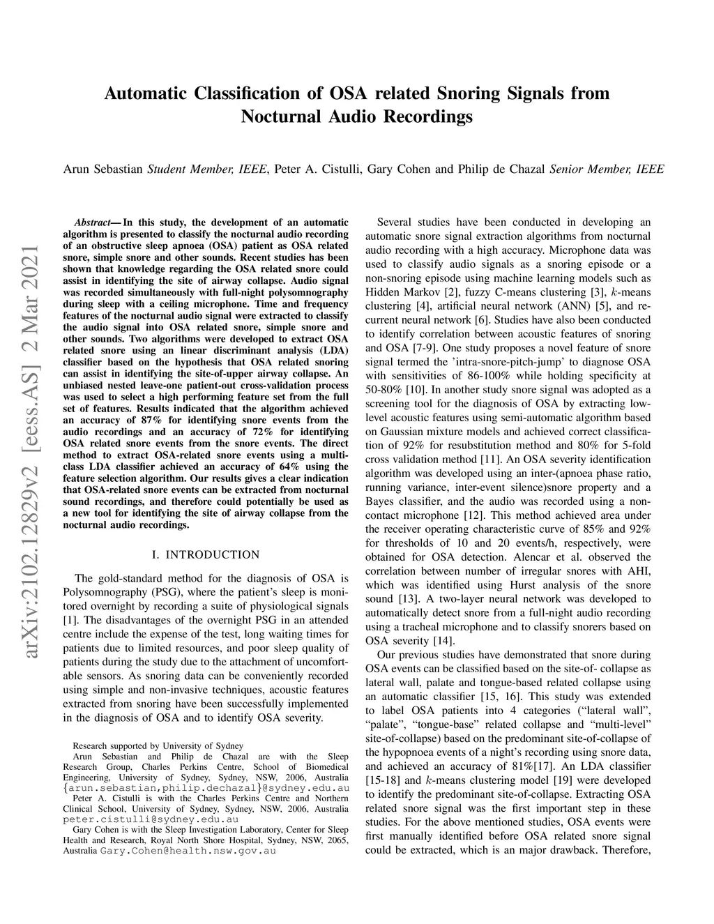 Automatic Classification of OSA related Snoring Signals from Nocturnal
