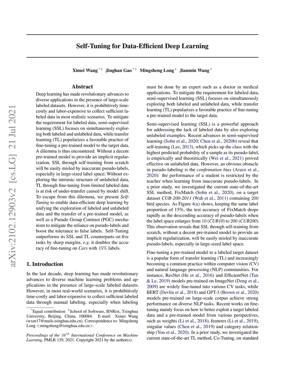 Deep learning has made revolutionary advances to diverse applications in the presence of large-scale labeled datasets. However, it is prohibitively time-costly and labor-expensive to collect sufficient labeled data in most realistic scenarios. To mitigate the requirement for labeled data, semi-supervised learning (SSL) focuses on simultaneously exploring both labeled and unlabeled data, while transfer learning (TL) popularizes a favorable practice of fine-tuning a pre-trained model to the target data. A dilemma is thus encountered: Without a decent pre-trained model to provide an implicit regularization, SSL through self-training from scratch will be easily misled by inaccurate pseudo-labels, especially in large-sized label space; Without exploring the intrinsic structure of unlabeled data, TL through fine-tuning from limited labeled data is at risk of under-transfer caused by model shift. To escape from this dilemma, we present Self-Tuning to enable data-efficient deep learning by unifying the exploration of labeled and unlabeled data and the transfer of a pre-trained model, as well as a Pseudo Group Contrast (PGC) mechanism to mitigate the reliance on pseudo-labels and boost the tolerance to false labels. Self-Tuning outperforms its SSL and TL counterparts on five tasks by sharp margins, e.g. it doubles the accuracy of fine-tuning on Cars with 15% labels.