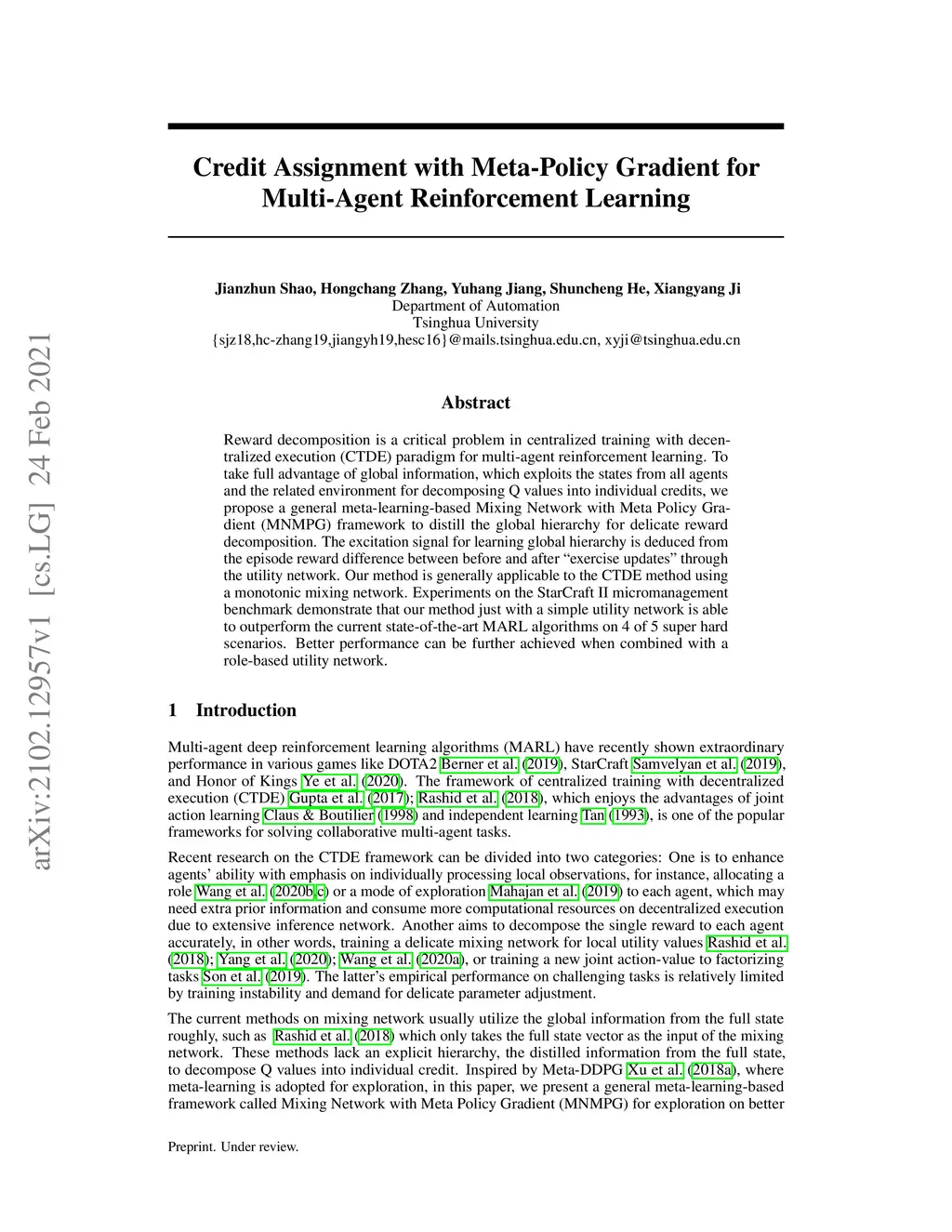 Reward decomposition is a critical problem in centralized training with decentralized execution~(CTDE) paradigm for multi-agent reinforcement learning. To take full advantage of global information, which exploits the states from all agents and the related environment for decomposing Q values into individual credits, we propose a general meta-learning-based Mixing Network with Meta Policy Gradient~(MNMPG) framework to distill the global hierarchy for delicate reward decomposition. The excitation signal for learning global hierarchy is deduced from the episode reward difference between before and after "exercise updates" through the utility network. Our method is generally applicable to the CTDE method using a monotonic mixing network. Experiments on the StarCraft II micromanagement benchmark demonstrate that our method just with a simple utility network is able to outperform the current state-of-the-art MARL algorithms on 4 of 5 super hard scenarios. Better performance can be further achieved when combined with a role-based utility network.