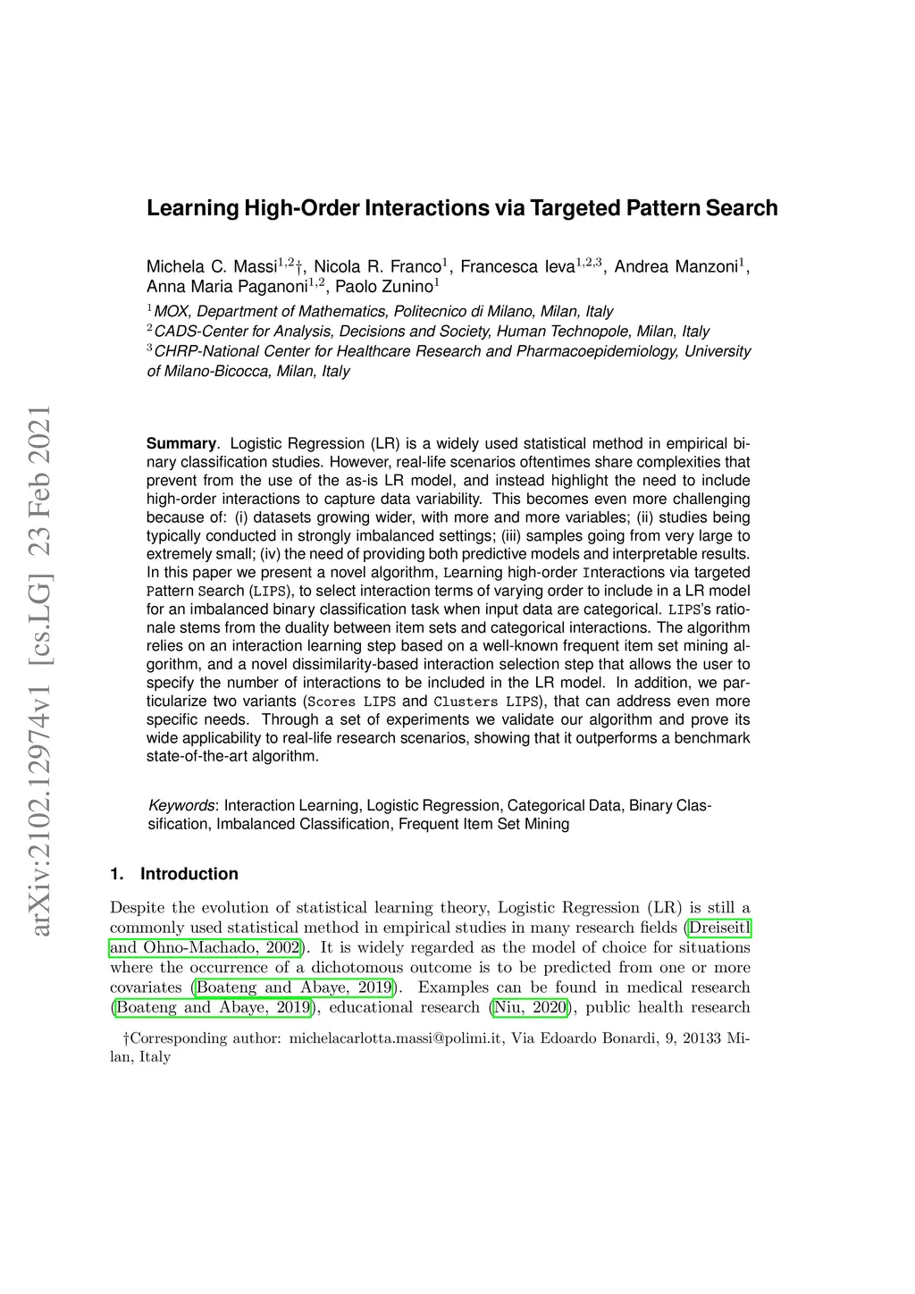Logistic Regression (LR) is a widely used statistical method in empirical binary classification studies. However, real-life scenarios oftentimes share complexities that prevent from the use of the as-is LR model, and instead highlight the need to include high-order interactions to capture data variability. This becomes even more challenging because of: (i) datasets growing wider, with more and more variables; (ii) studies being typically conducted in strongly imbalanced settings; (iii) samples going from very large to extremely small; (iv) the need of providing both predictive models and interpretable results. In this paper we present a novel algorithm, Learning high-order Interactions via targeted Pattern Search (LIPS), to select interaction terms of varying order to include in a LR model for an imbalanced binary classification task when input data are categorical. LIPS's rationale stems from the duality between item sets and categorical interactions. The algorithm relies on an interaction learning step based on a well-known frequent item set mining algorithm, and a novel dissimilarity-based interaction selection step that allows the user to specify the number of interactions to be included in the LR model. In addition, we particularize two variants (Scores LIPS and Clusters LIPS), that can address even more specific needs. Through a set of experiments we validate our algorithm and prove its wide applicability to real-life research scenarios, showing that it outperforms a benchmark state-of-the-art algorithm.