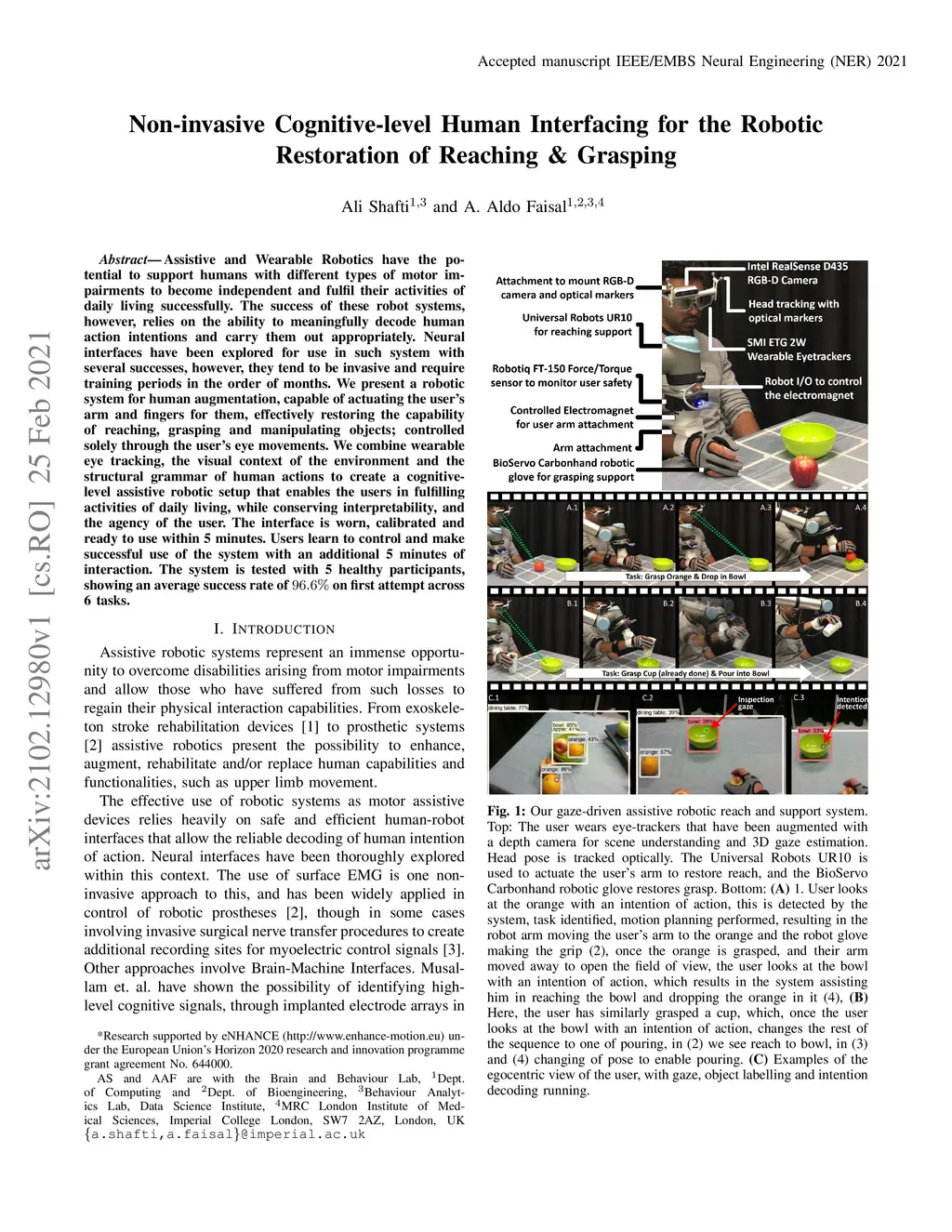 Assistive and Wearable Robotics have the potential to support humans with different types of motor impairments to become independent and fulfil their activities of daily living successfully. The success of these robot systems, however, relies on the ability to meaningfully decode human action intentions and carry them out appropriately. Neural interfaces have been explored for use in such system with several successes, however, they tend to be invasive and require training periods in the order of months. We present a robotic system for human augmentation, capable of actuating the user's arm and fingers for them, effectively restoring the capability of reaching, grasping and manipulating objects; controlled solely through the user's eye movements. We combine wearable eye tracking, the visual context of the environment and the structural grammar of human actions to create a cognitive-level assistive robotic setup that enables the users in fulfilling activities of daily living, while conserving interpretability, and the agency of the user. The interface is worn, calibrated and ready to use within 5 minutes. Users learn to control and make successful use of the system with an additional 5 minutes of interaction. The system is tested with 5 healthy participants, showing an average success rate of on first attempt across 6 tasks.