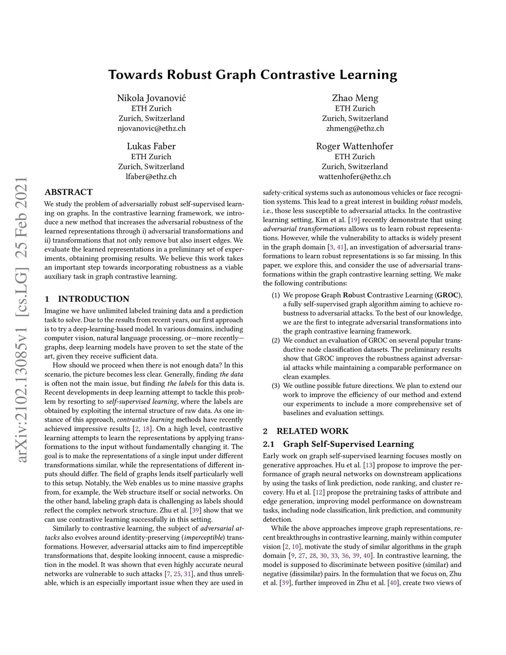 We study the problem of adversarially robust self-supervised learning on graphs. In the contrastive learning framework, we introduce a new method that increases the adversarial robustness of the learned representations through i) adversarial transformations and ii) transformations that not only remove but also insert edges. We evaluate the learned representations in a preliminary set of experiments, obtaining promising results. We believe this work takes an important step towards incorporating robustness as a viable auxiliary task in graph contrastive learning.