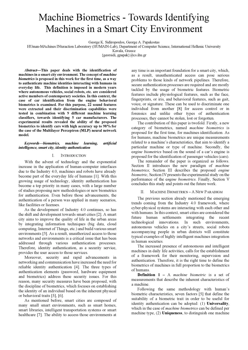 This paper deals with the identification of machines in a smart city environment. The concept of machine biometrics is proposed in this work for the first time, as a way to authenticate machine identities interacting with humans in everyday life. This definition is imposed in modern years where autonomous vehicles, social robots, etc. are considered active members of contemporary societies. In this context, the case of car identification from the engine behavioral biometrics is examined. For this purpose, 22 sound features were extracted and their discrimination capabilities were tested in combination with 9 different machine learning classifiers, towards identifying 5 car manufacturers. The experimental results revealed the ability of the proposed biometrics to identify cars with high accuracy up to 98% for the case of the Multilayer Perceptron (MLP) neural network model.