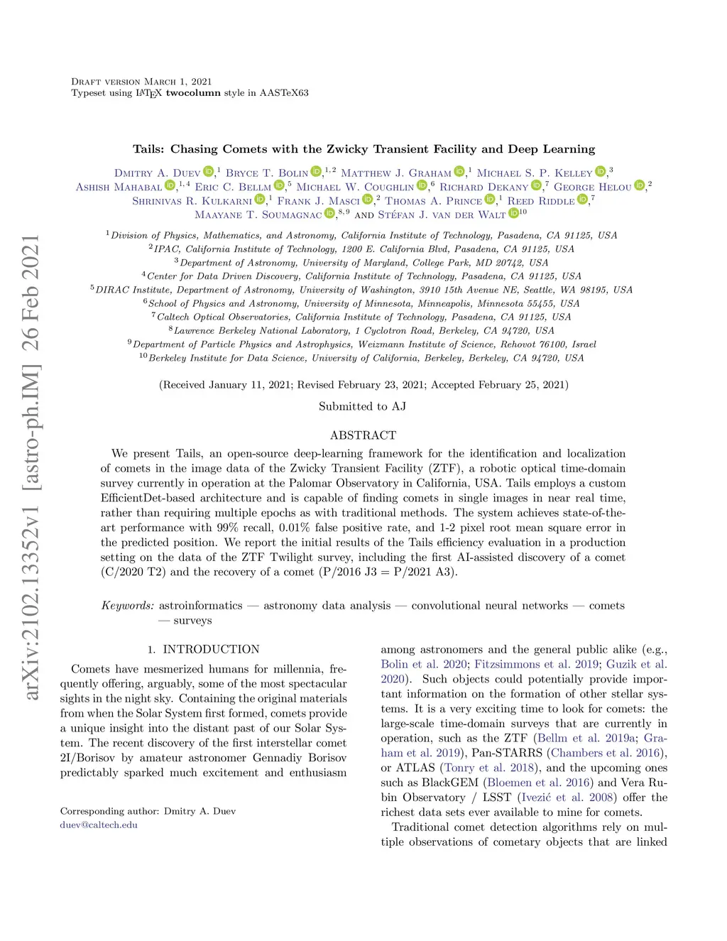 We present Tails, an open-source deep-learning framework for the identification and localization of comets in the image data of the Zwicky Transient Facility (ZTF), a robotic optical time-domain survey currently in operation at the Palomar Observatory in California, USA. Tails employs a custom EfficientDet-based architecture and is capable of finding comets in single images in near real time, rather than requiring multiple epochs as with traditional methods. The system achieves state-of-the-art performance with 99% recall, 0.01% false positive rate, and 1-2 pixel root mean square error in the predicted position. We report the initial results of the Tails efficiency evaluation in a production setting on the data of the ZTF Twilight survey, including the first AI-assisted discovery of a comet (C/2020 T2) and the recovery of a comet (P/2016 J3 = P/2021 A3).