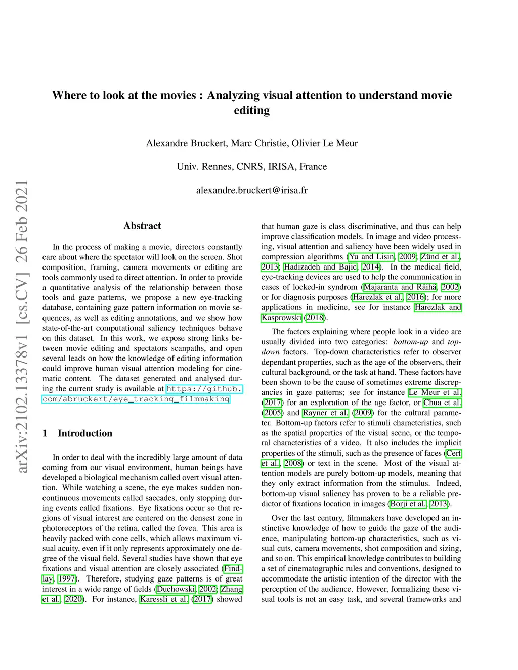 In the process of making a movie, directors constantly care about where the spectator will look on the screen. Shot composition, framing, camera movements or editing are tools commonly used to direct attention. In order to provide a quantitative analysis of the relationship between those tools and gaze patterns, we propose a new eye-tracking database, containing gaze pattern information on movie sequences, as well as editing annotations, and we show how state-of-the-art computational saliency techniques behave on this dataset. In this work, we expose strong links between movie editing and spectators scanpaths, and open several leads on how the knowledge of editing information could improve human visual attention modeling for cinematic content. The dataset generated and analysed during the current study is available at https://github.com/abruckert/eye_tracking_filmmaking