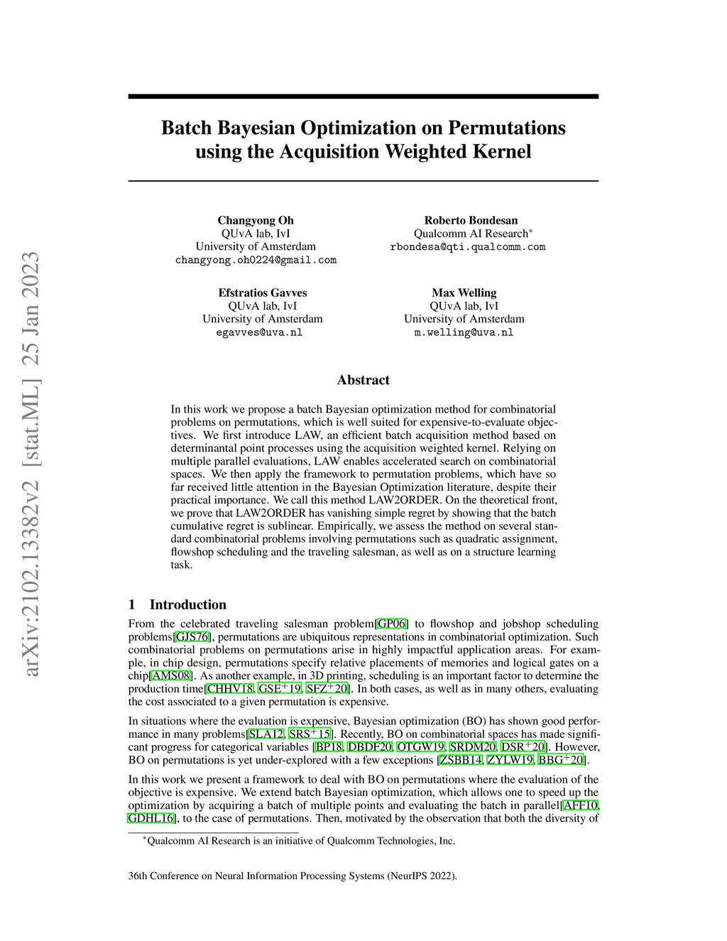 In this work we propose a batch Bayesian optimization method for combinatorial problems on permutations, which is well suited for expensive-to-evaluate objectives. We first introduce LAW, an efficient batch acquisition method based on determinantal point processes using the acquisition weighted kernel. Relying on multiple parallel evaluations, LAW enables accelerated search on combinatorial spaces. We then apply the framework to permutation problems, which have so far received little attention in the Bayesian Optimization literature, despite their practical importance. We call this method LAW2ORDER. On the theoretical front, we prove that LAW2ORDER has vanishing simple regret by showing that the batch cumulative regret is sublinear. Empirically, we assess the method on several standard combinatorial problems involving permutations such as quadratic assignment, flowshop scheduling and the traveling salesman, as well as on a structure learning task.