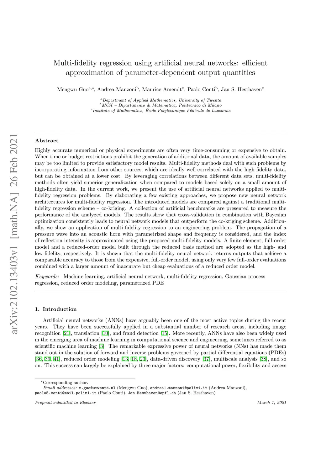 Highly accurate numerical or physical experiments are often time-consuming or expensive to obtain. When time or budget restrictions prohibit the generation of additional data, the amount of available samples may be too limited to provide satisfactory model results. Multi-fidelity methods deal with such problems by incorporating information from other sources, which are ideally well-correlated with the high-fidelity data, but can be obtained at a lower cost. By leveraging correlations between different data sets, multi-fidelity methods often yield superior generalization when compared to models based solely on a small amount of high-fidelity data. In this work, we present the use of artificial neural networks applied to multi-fidelity regression problems. By elaborating a few existing approaches, we propose new neural network architectures for multi-fidelity regression. The introduced models are compared against a traditional multi-fidelity scheme, co-kriging. A collection of artificial benchmarks are presented to measure the performance of the analyzed models. The results show that cross-validation in combination with Bayesian optimization consistently leads to neural network models that outperform the co-kriging scheme. Additionally, we show an application of multi-fidelity regression to an engineering problem. The propagation of a pressure wave into an acoustic horn with parametrized shape and frequency is considered, and the index of reflection intensity is approximated using the multi-fidelity models. A finite element model and a reduced basis model are adopted as the high- and low-fidelity, respectively. It is shown that the multi-fidelity neural network returns outputs that achieve a comparable accuracy to those from the expensive, full-order model, using only very few full-order evaluations combined with a larger amount of inaccurate but cheap evaluations of a reduced order model.