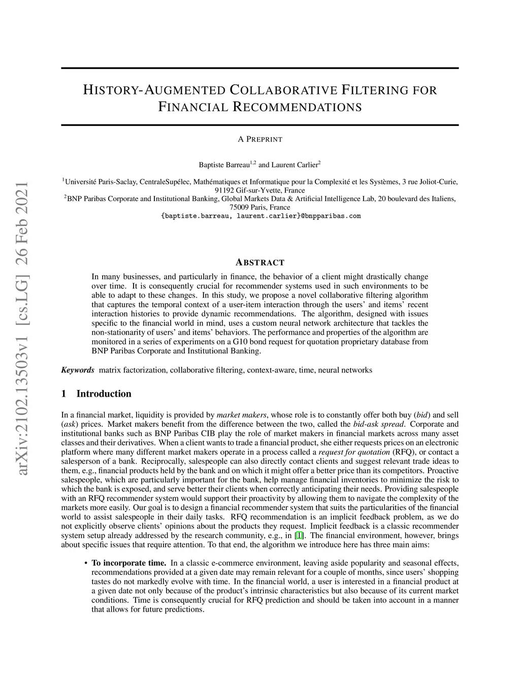 In many businesses, and particularly in finance, the behavior of a client might drastically change over time. It is consequently crucial for recommender systems used in such environments to be able to adapt to these changes. In this study, we propose a novel collaborative filtering algorithm that captures the temporal context of a user-item interaction through the users' and items' recent interaction histories to provide dynamic recommendations. The algorithm, designed with issues specific to the financial world in mind, uses a custom neural network architecture that tackles the non-stationarity of users' and items' behaviors. The performance and properties of the algorithm are monitored in a series of experiments on a G10 bond request for quotation proprietary database from BNP Paribas Corporate and Institutional Banking.