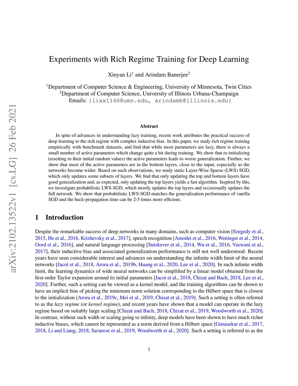 In spite of advances in understanding lazy training, recent work attributes the practical success of deep learning to the rich regime with complex inductive bias. In this paper, we study rich regime training empirically with benchmark datasets, and find that while most parameters are lazy, there is always a small number of active parameters which change quite a bit during training. We show that re-initializing (resetting to their initial random values) the active parameters leads to worse generalization. Further, we show that most of the active parameters are in the bottom layers, close to the input, especially as the networks become wider. Based on such observations, we study static Layer-Wise Sparse (LWS) SGD, which only updates some subsets of layers. We find that only updating the top and bottom layers have good generalization and, as expected, only updating the top layers yields a fast algorithm. Inspired by this, we investigate probabilistic LWS-SGD, which mostly updates the top layers and occasionally updates the full network. We show that probabilistic LWS-SGD matches the generalization performance of vanilla SGD and the back-propagation time can be 2-5 times more efficient.