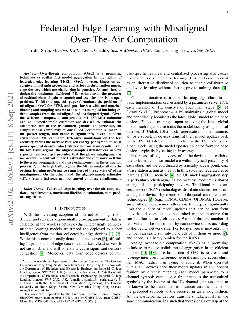 Over-the-air computation (OAC) is a promising technique to realize fast model aggregation in the uplink of federated edge learning. OAC, however, hinges on accurate channel-gain precoding and strict synchronization among the edge devices, which are challenging in practice. As such, how to design the maximum likelihood (ML) estimator in the presence of residual channel-gain mismatch and asynchronies is an open problem. To fill this gap, this paper formulates the problem of misaligned OAC for federated edge learning and puts forth a whitened matched filtering and sampling scheme to obtain oversampled, but independent, samples from the misaligned and overlapped signals. Given the whitened samples, a sum-product ML estimator and an aligned-sample estimator are devised to estimate the arithmetic sum of the transmitted symbols. In particular, the computational complexity of our sum-product ML estimator is linear in the packet length and hence is significantly lower than the conventional ML estimator. Extensive simulations on the test accuracy versus the average received energy per symbol to noise power spectral density ratio (EsN0) yield two main results: 1) In the low EsN0 regime, the aligned-sample estimator can achieve superior test accuracy provided that the phase misalignment is non-severe. In contrast, the ML estimator does not work well due to the error propagation and noise enhancement in the estimation process. 2) In the high EsN0 regime, the ML estimator attains the optimal learning performance regardless of the severity of phase misalignment. On the other hand, the aligned-sample estimator suffers from a test-accuracy loss caused by phase misalignment.