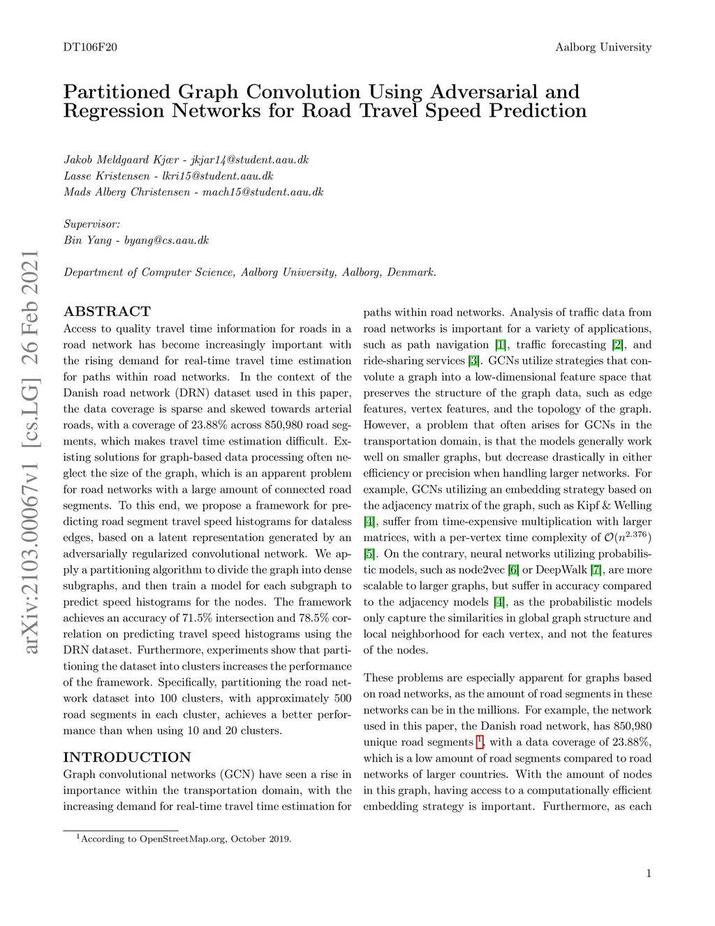 Access to quality travel time information for roads in a road network has become increasingly important with the rising demand for real-time travel time estimation for paths within road networks. In the context of the Danish road network (DRN) dataset used in this paper, the data coverage is sparse and skewed towards arterial roads, with a coverage of 23.88% across 850,980 road segments, which makes travel time estimation difficult. Existing solutions for graph-based data processing often neglect the size of the graph, which is an apparent problem for road networks with a large amount of connected road segments. To this end, we propose a framework for predicting road segment travel speed histograms for dataless edges, based on a latent representation generated by an adversarially regularized convolutional network. We apply a partitioning algorithm to divide the graph into dense subgraphs, and then train a model for each subgraph to predict speed histograms for the nodes. The framework achieves an accuracy of 71.5% intersection and 78.5% correlation on predicting travel speed histograms using the DRN dataset. Furthermore, experiments show that partitioning the dataset into clusters increases the performance of the framework. Specifically, partitioning the road network dataset into 100 clusters, with approximately 500 road segments in each cluster, achieves a better performance than when using 10 and 20 clusters.