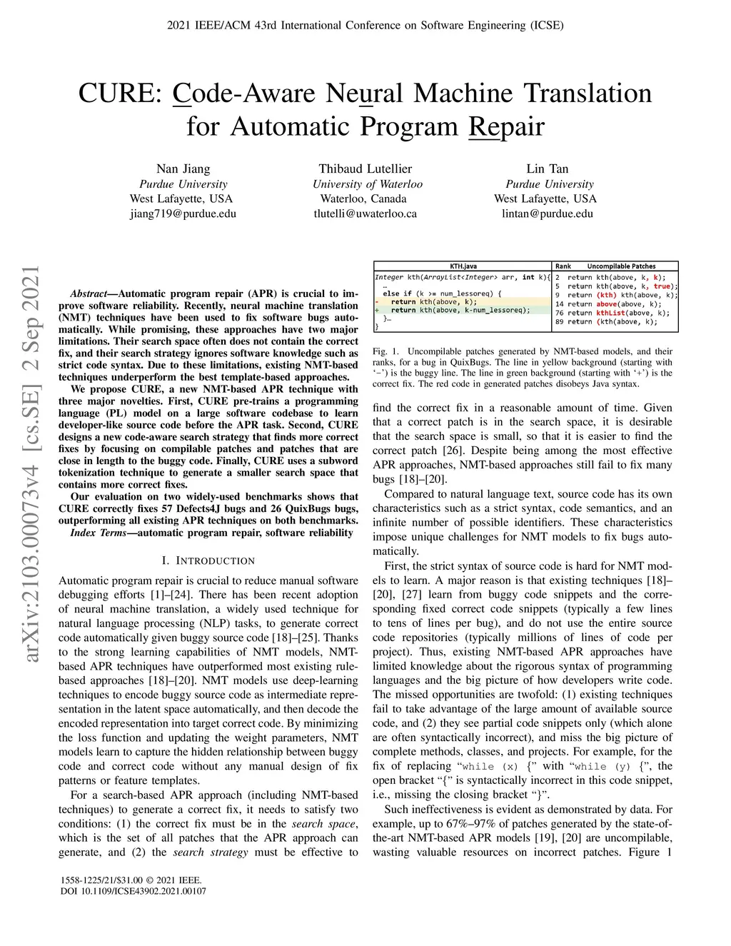 CURE: Code-Aware Neural Machine Translation for Automatic Program Repair