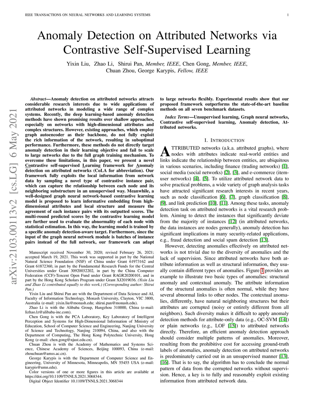 Anomaly detection on attributed networks attracts considerable research interests due to wide applications of attributed networks in modeling a wide range of complex systems. Recently, the deep learning-based anomaly detection methods have shown promising results over shallow approaches, especially on networks with high-dimensional attributes and complex structures. However, existing approaches, which employ graph autoencoder as their backbone, do not fully exploit the rich information of the network, resulting in suboptimal performance. Furthermore, these methods do not directly target anomaly detection in their learning objective and fail to scale to large networks due to the full graph training mechanism. To overcome these limitations, in this paper, we present a novel contrastive self-supervised learning framework for anomaly detection on attributed networks. Our framework fully exploits the local information from network data by sampling a novel type of contrastive instance pair, which can capture the relationship between each node and its neighboring substructure in an unsupervised way. Meanwhile, a well-designed graph neural network-based contrastive learning model is proposed to learn informative embedding from high-dimensional attributes and local structure and measure the agreement of each instance pairs with its outputted scores. The multi-round predicted scores by the contrastive learning model are further used to evaluate the abnormality of each node with statistical estimation. In this way, the learning model is trained by a specific anomaly detection-aware target. Furthermore, since the input of the graph neural network module is batches of instance pairs instead of the full network, our framework can adapt to large networks flexibly. Experimental results show that our proposed framework outperforms the state-of-the-art baseline methods on all seven benchmark datasets.