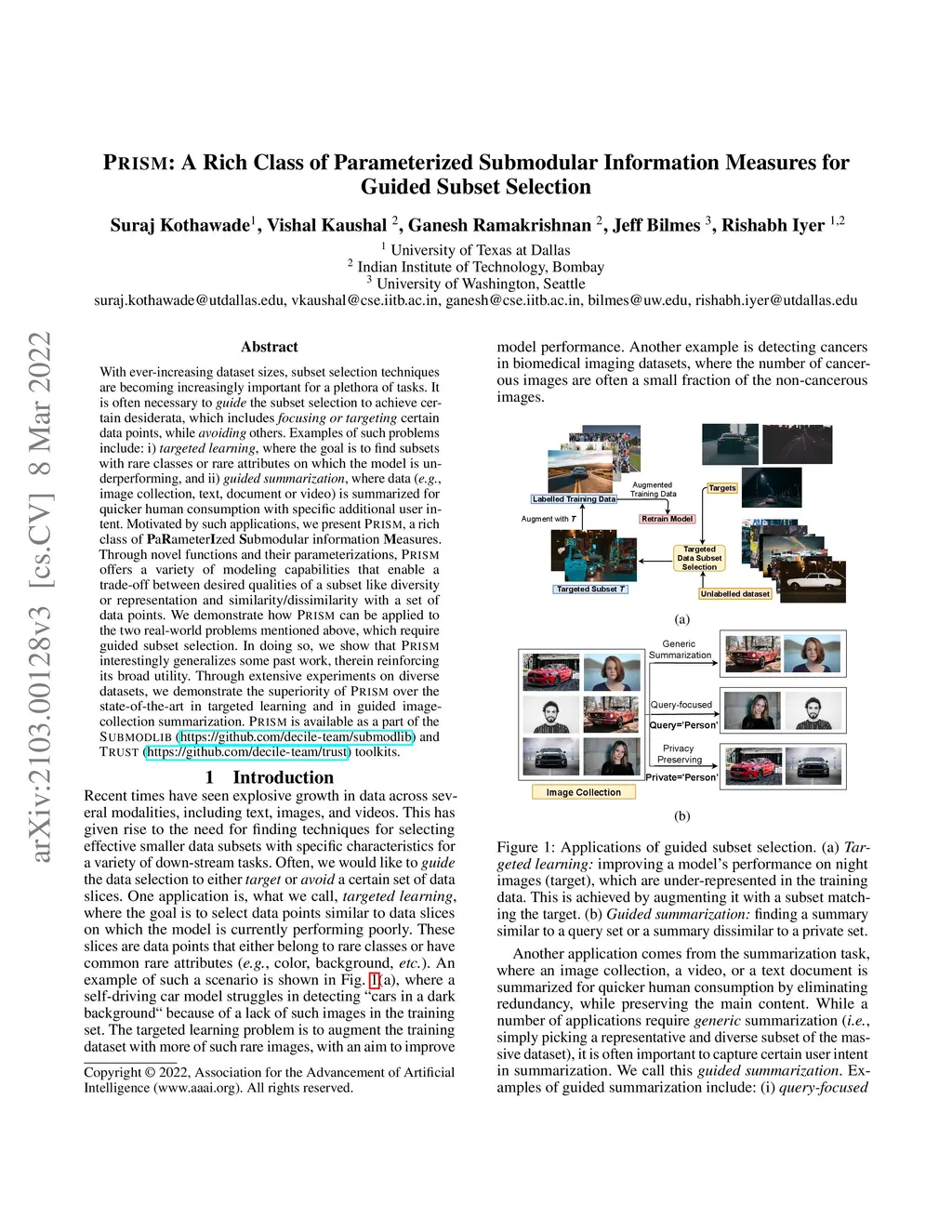 With ever-increasing dataset sizes, subset selection techniques are becoming increasingly important for a plethora of tasks. It is often necessary to guide the subset selection to achieve certain desiderata, which includes focusing or targeting certain data points, while avoiding others. Examples of such problems include: i)targeted learning, where the goal is to find subsets with rare classes or rare attributes on which the model is underperforming, and ii)guided summarization, where data (e.g., image collection, text, document or video) is summarized for quicker human consumption with specific additional user intent. Motivated by such applications, we present PRISM, a rich class of PaRameterIzed Submodular information Measures. Through novel functions and their parameterizations, PRISM offers a variety of modeling capabilities that enable a trade-off between desired qualities of a subset like diversity or representation and similarity/dissimilarity with a set of data points. We demonstrate how PRISM can be applied to the two real-world problems mentioned above, which require guided subset selection. In doing so, we show that PRISM interestingly generalizes some past work, therein reinforcing its broad utility. Through extensive experiments on diverse datasets, we demonstrate the superiority of PRISM over the state-of-the-art in targeted learning and in guided image-collection summarization