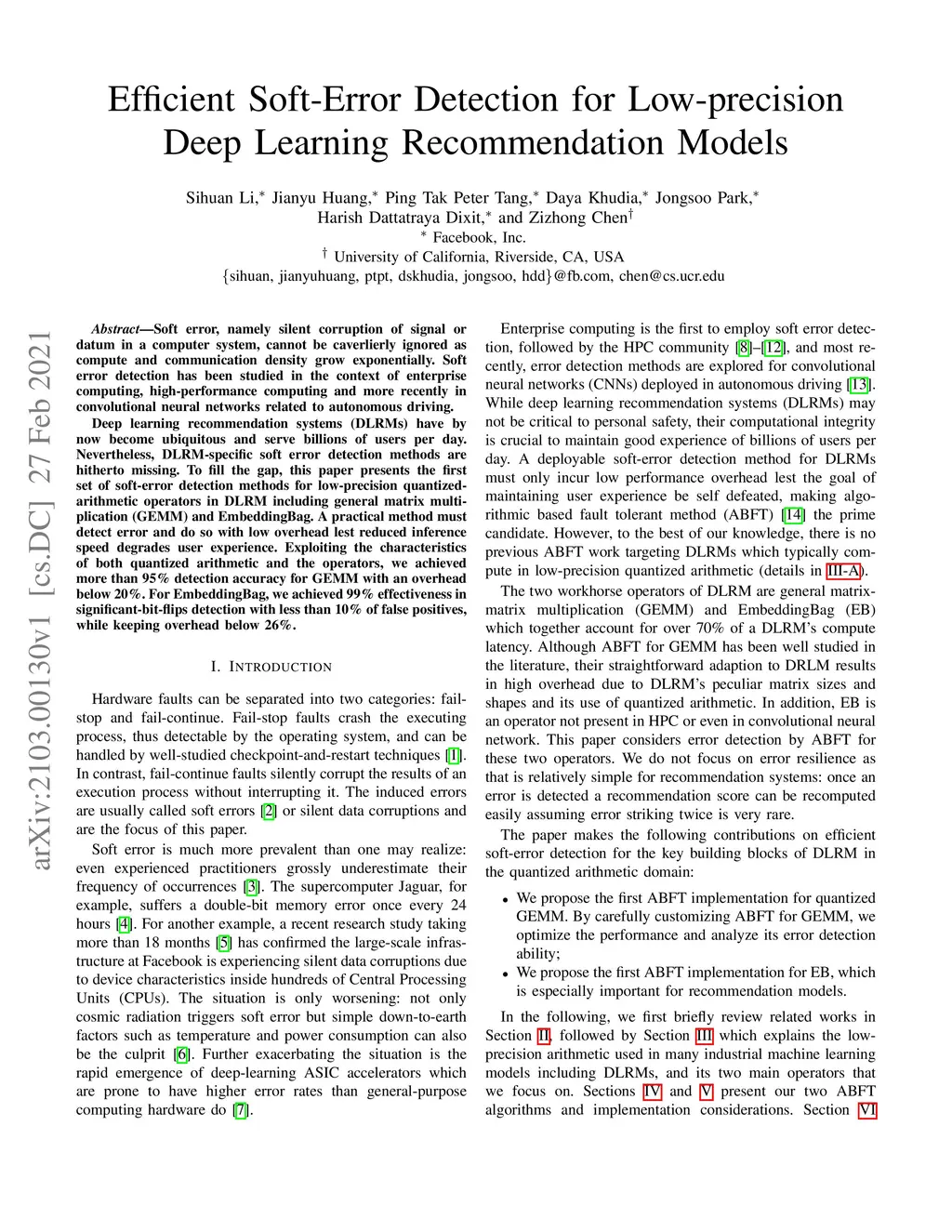 Soft error, namely silent corruption of signal or datum in a computer system, cannot be caverlierly ignored as compute and communication density grow exponentially. Soft error detection has been studied in the context of enterprise computing, high-performance computing and more recently in convolutional neural networks related to autonomous driving. Deep learning recommendation systems (DLRMs) have by now become ubiquitous and serve billions of users per day. Nevertheless, DLRM-specific soft error detection methods are hitherto missing. To fill the gap, this paper presents the first set of soft-error detection methods for low-precision quantized-arithmetic operators in DLRM including general matrix multiplication (GEMM) and EmbeddingBag. A practical method must detect error and do so with low overhead lest reduced inference speed degrades user experience. Exploiting the characteristics of both quantized arithmetic and the operators, we achieved more than 95% detection accuracy for GEMM with an overhead below 20%. For EmbeddingBag, we achieved 99% effectiveness in significant-bit-flips detection with less than 10% of false positives, while keeping overhead below 26%.