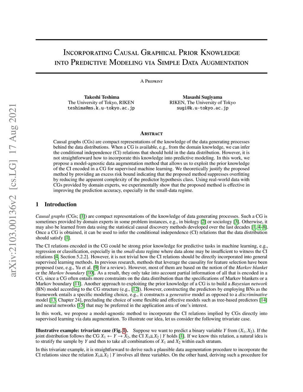 Causal graphs (CGs) are compact representations of the knowledge of the data generating processes behind the data distributions. When a CG is available, e.g., from the domain knowledge, we can infer the conditional independence (CI) relations that should hold in the data distribution. However, it is not straightforward how to incorporate this knowledge into predictive modeling. In this work, we propose a model-agnostic data augmentation method that allows us to exploit the prior knowledge of the CI encoded in a CG for supervised machine learning. We theoretically justify the proposed method by providing an excess risk bound indicating that the proposed method suppresses overfitting by reducing the apparent complexity of the predictor hypothesis class. Using real-world data with CGs provided by domain experts, we experimentally show that the proposed method is effective in improving the prediction accuracy, especially in the small-data regime.