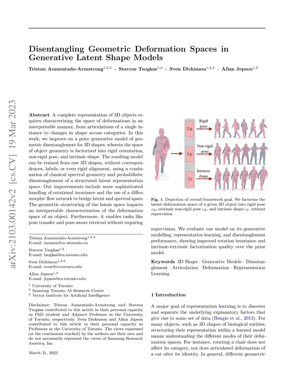A complete representation of 3D objects requires characterizing the space of deformations in an interpretable manner, from articulations of a single instance to changes in shape across categories. In this work, we improve on a prior generative model of geometric disentanglement for 3D shapes, wherein the space of object geometry is factorized into rigid orientation, non-rigid pose, and intrinsic shape. The resulting model can be trained from raw 3D shapes, without correspondences, labels, or even rigid alignment, using a combination of classical spectral geometry and probabilistic disentanglement of a structured latent representation space. Our improvements include more sophisticated handling of rotational invariance and the use of a diffeomorphic flow network to bridge latent and spectral space. The geometric structuring of the latent space imparts an interpretable characterization of the deformation space of an object. Furthermore, it enables tasks like pose transfer and pose-aware retrieval without requiring supervision. We evaluate our model on its generative modelling, representation learning, and disentanglement performance, showing improved rotation invariance and intrinsic-extrinsic factorization quality over the prior model.