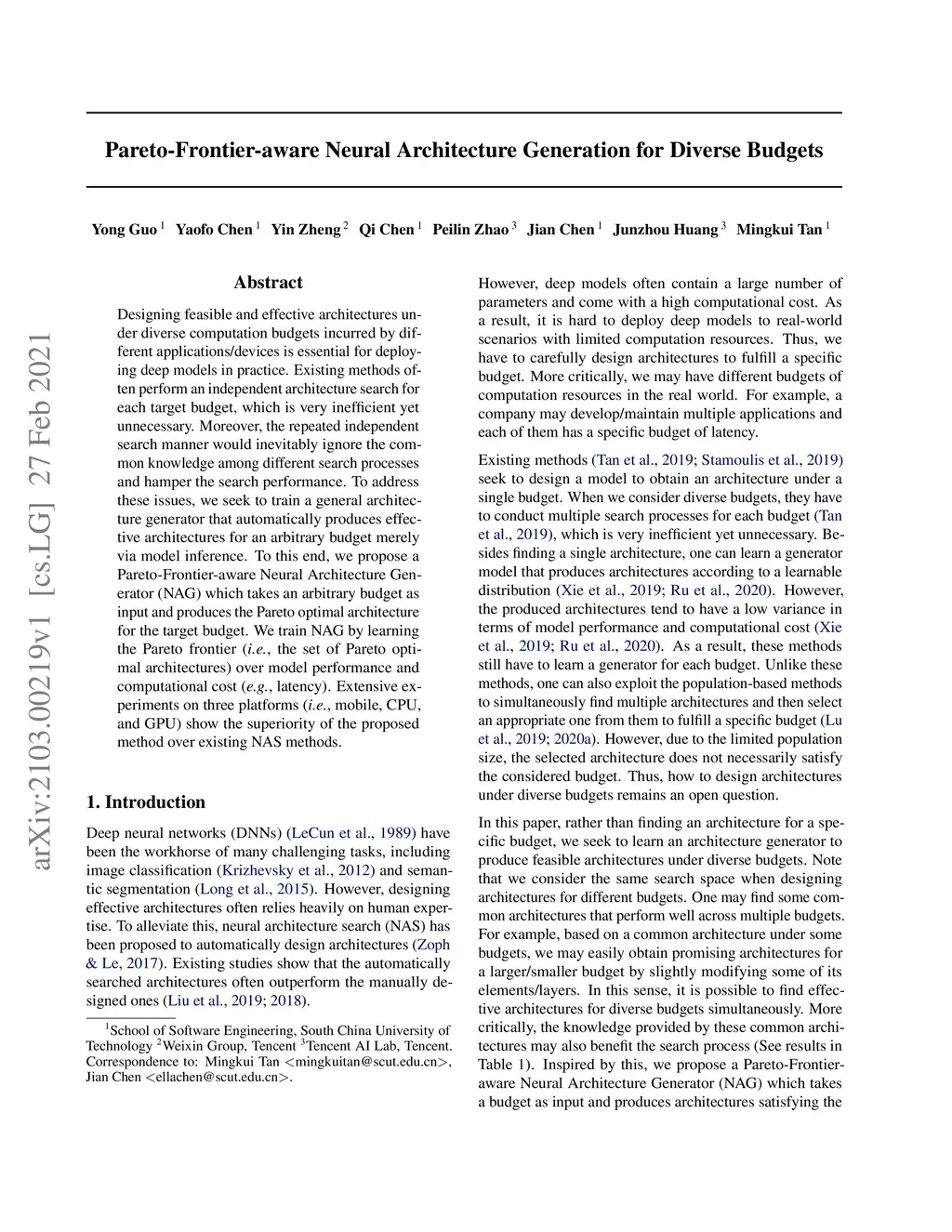 Pareto-Frontier-aware Neural Architecture Generation for Diverse Budgets