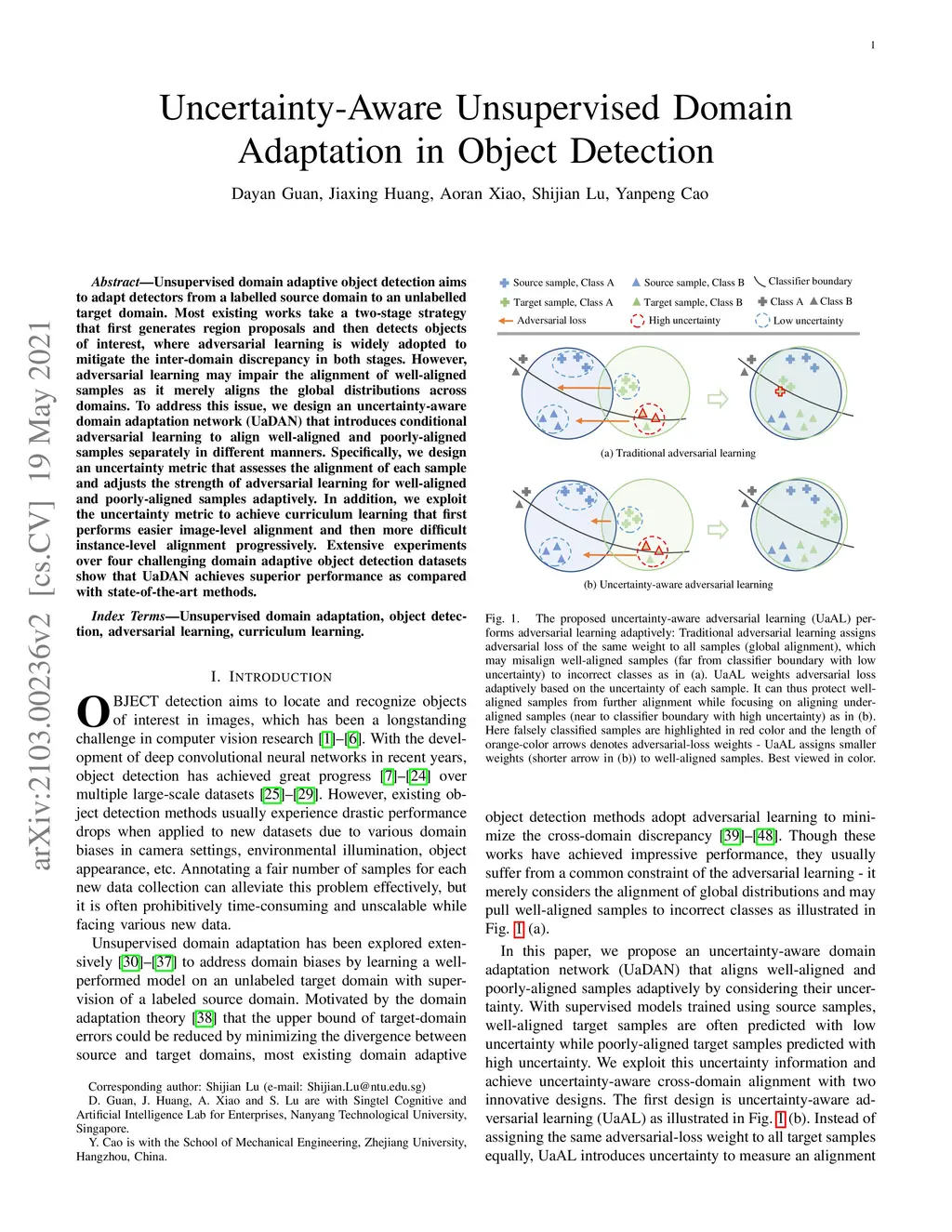 Unsupervised domain adaptive object detection aims to adapt detectors from a labelled source domain to an unlabelled target domain. Most existing works take a two-stage strategy that first generates region proposals and then detects objects of interest, where adversarial learning is widely adopted to mitigate the inter-domain discrepancy in both stages. However, adversarial learning may impair the alignment of well-aligned samples as it merely aligns the global distributions across domains. To address this issue, we design an uncertainty-aware domain adaptation network (UaDAN) that introduces conditional adversarial learning to align well-aligned and poorly-aligned samples separately in different manners. Specifically, we design an uncertainty metric that assesses the alignment of each sample and adjusts the strength of adversarial learning for well-aligned and poorly-aligned samples adaptively. In addition, we exploit the uncertainty metric to achieve curriculum learning that first performs easier image-level alignment and then more difficult instance-level alignment progressively. Extensive experiments over four challenging domain adaptive object detection datasets show that UaDAN achieves superior performance as compared with state-of-the-art methods.
