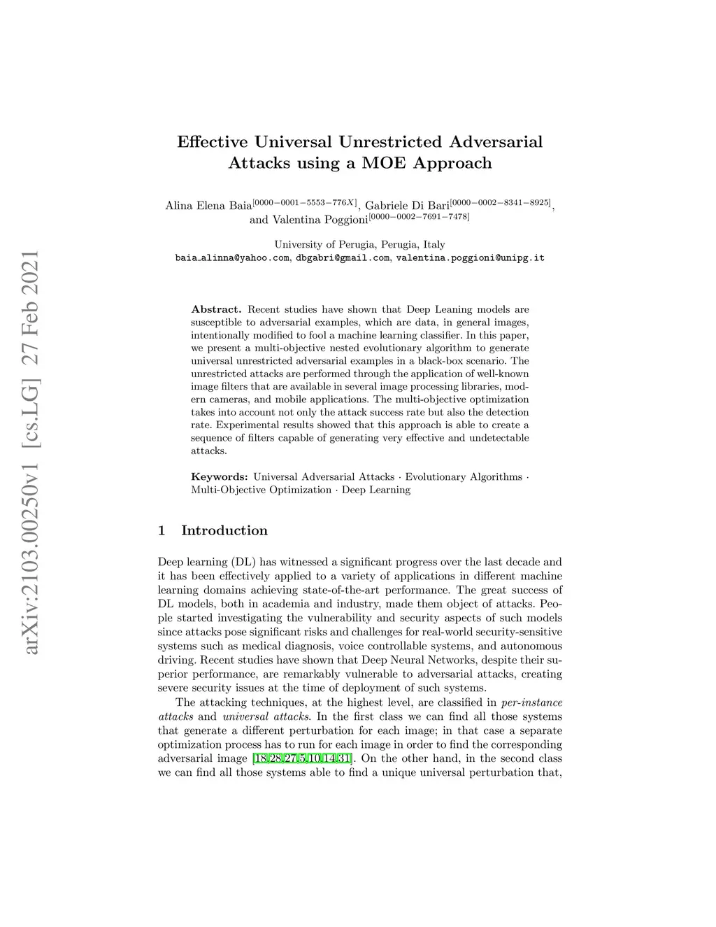 Recent studies have shown that Deep Leaning models are susceptible to adversarial examples, which are data, in general images, intentionally modified to fool a machine learning classifier. In this paper, we present a multi-objective nested evolutionary algorithm to generate universal unrestricted adversarial examples in a black-box scenario. The unrestricted attacks are performed through the application of well-known image filters that are available in several image processing libraries, modern cameras, and mobile applications. The multi-objective optimization takes into account not only the attack success rate but also the detection rate. Experimental results showed that this approach is able to create a sequence of filters capable of generating very effective and undetectable attacks.