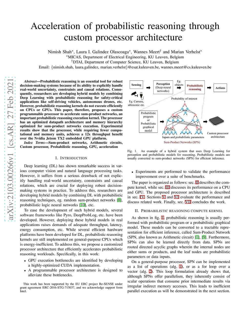 Probabilistic reasoning is an essential tool for robust decision-making systems because of its ability to explicitly handle real-world uncertainty, constraints and causal relations. Consequently, researchers are developing hybrid models by combining Deep Learning with probabilistic reasoning for safety-critical applications like self-driving vehicles, autonomous drones, etc. However, probabilistic reasoning kernels do not execute efficiently on CPUs or GPUs. This paper, therefore, proposes a custom programmable processor to accelerate sum-product networks, an important probabilistic reasoning execution kernel. The processor has an optimized datapath architecture and memory hierarchy optimized for sum-product networks execution. Experimental results show that the processor, while requiring fewer computational and memory units, achieves a 12x throughput benefit over the Nvidia Jetson TX2 embedded GPU platform.