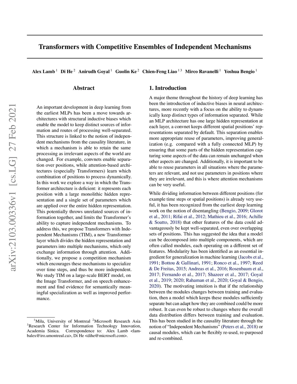 Transformers with Competitive Ensembles of Independent Mechanisms