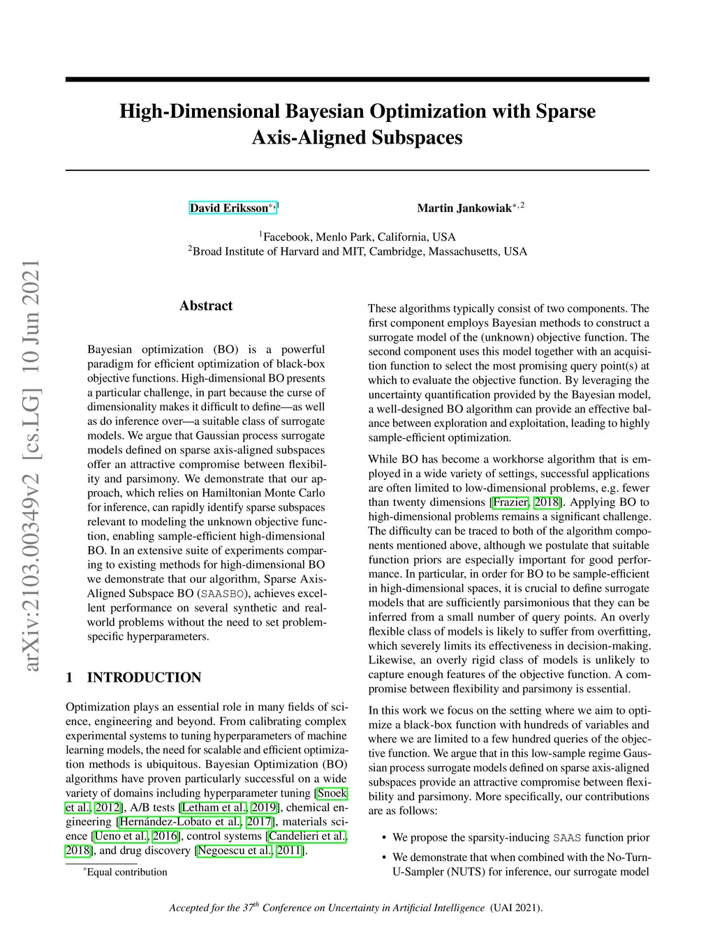 Bayesian optimization (BO) is a powerful paradigm for efficient optimization of black-box objective functions. High-dimensional BO presents a particular challenge, in part because the curse of dimensionality makes it difficult to define -- as well as do inference over -- a suitable class of surrogate models. We argue that Gaussian process surrogate models defined on sparse axis-aligned subspaces offer an attractive compromise between flexibility and parsimony. We demonstrate that our approach, which relies on Hamiltonian Monte Carlo for inference, can rapidly identify sparse subspaces relevant to modeling the unknown objective function, enabling sample-efficient high-dimensional BO. In an extensive suite of experiments comparing to existing methods for high-dimensional BO we demonstrate that our algorithm, Sparse Axis-Aligned Subspace BO (SAASBO), achieves excellent performance on several synthetic and real-world problems without the need to set problem-specific hyperparameters.