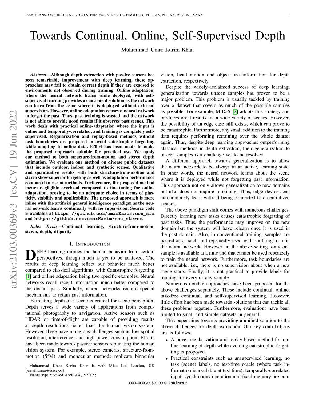 Although depth extraction with passive sensors has seen remarkable improvement with deep learning, these approaches may fail to obtain correct depth if they are exposed to environments not observed during training. Online adaptation, where the neural network trains while deployed, with self-supervised learning provides a convenient solution as the network can learn from the scene where it is deployed without external supervision. However, online adaptation causes a neural network to forget the past. Thus, past training is wasted and the network is not able to provide good results if it observes past scenes. This work deals with practical online-adaptation where the input is online and temporally-correlated, and training is completely self-supervised. Regularization and replay-based methods without task boundaries are proposed to avoid catastrophic forgetting while adapting to online data. Effort has been made to make the proposed approach suitable for practical use. We apply our method to both structure-from-motion and stereo depth estimation. We evaluate our method on diverse public datasets that include outdoor, indoor and synthetic scenes. Qualitative and quantitative results with both structure-from-motion and stereo show superior forgetting as well as adaptation performance compared to recent methods. Furthermore, the proposed method incurs negligible overhead compared to fine-tuning for online adaptation, proving to be an adequate choice in terms of plasticity, stability and applicability. The proposed approach is more inline with the artificial general intelligence paradigm as the neural network learns continually with no supervision. Source code is available at https://github.com/umarKarim/cou_sfm and https://github.com/umarKarim/cou_stereo.