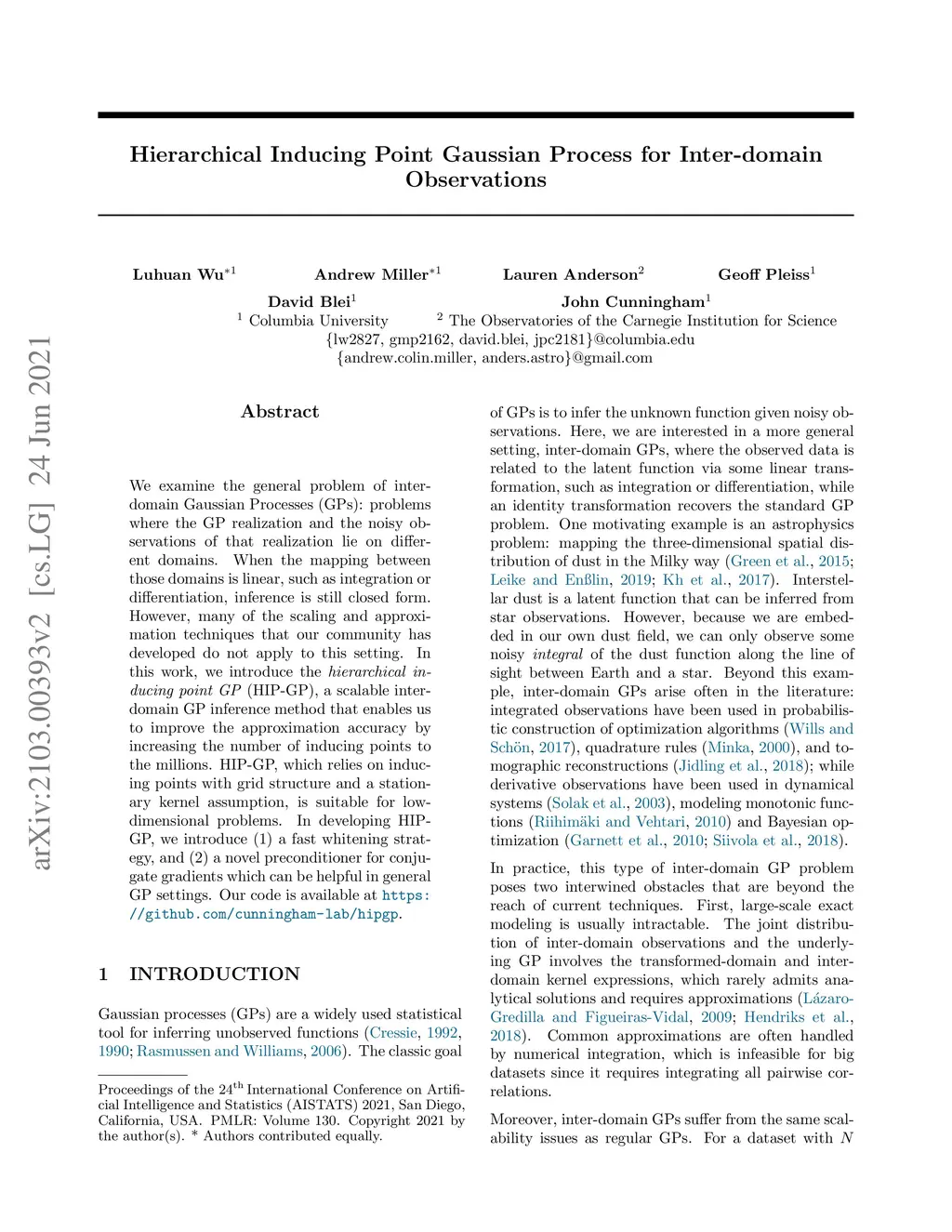 We examine the general problem of inter-domain Gaussian Processes (GPs): problems where the GP realization and the noisy observations of that realization lie on different domains. When the mapping between those domains is linear, such as integration or differentiation, inference is still closed form. However, many of the scaling and approximation techniques that our community has developed do not apply to this setting. In this work, we introduce the hierarchical inducing point GP (HIP-GP), a scalable inter-domain GP inference method that enables us to improve the approximation accuracy by increasing the number of inducing points to the millions. HIP-GP, which relies on inducing points with grid structure and a stationary kernel assumption, is suitable for low-dimensional problems. In developing HIP-GP, we introduce (1) a fast whitening strategy, and (2) a novel preconditioner for conjugate gradients which can be helpful in general GP settings. Our code is available at https: //github.com/cunningham-lab/hipgp.