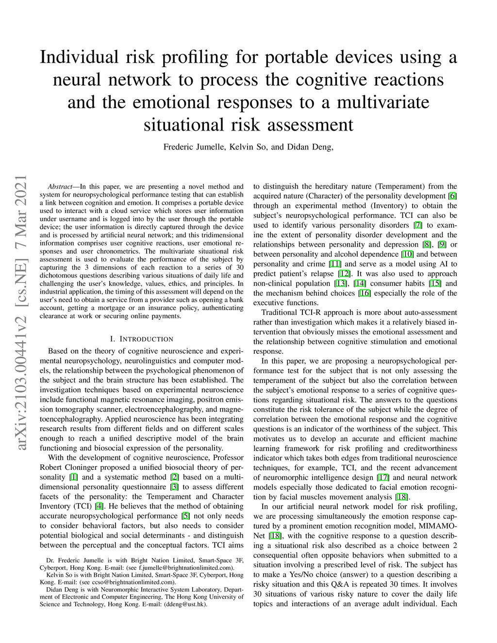 In this paper, we are presenting a novel method and system for neuropsychological performance testing that can establish a link between cognition and emotion. It comprises a portable device used to interact with a cloud service which stores user information under username and is logged into by the user through the portable device; the user information is directly captured through the device and is processed by artificial neural network; and this tridimensional information comprises user cognitive reactions, user emotional responses and user chronometrics. The multivariate situational risk assessment is used to evaluate the performance of the subject by capturing the 3 dimensions of each reaction to a series of 30 dichotomous questions describing various situations of daily life and challenging the user's knowledge, values, ethics, and principles. In industrial application, the timing of this assessment will depend on the user's need to obtain a service from a provider such as opening a bank account, getting a mortgage or an insurance policy, authenticating clearance at work or securing online payments.