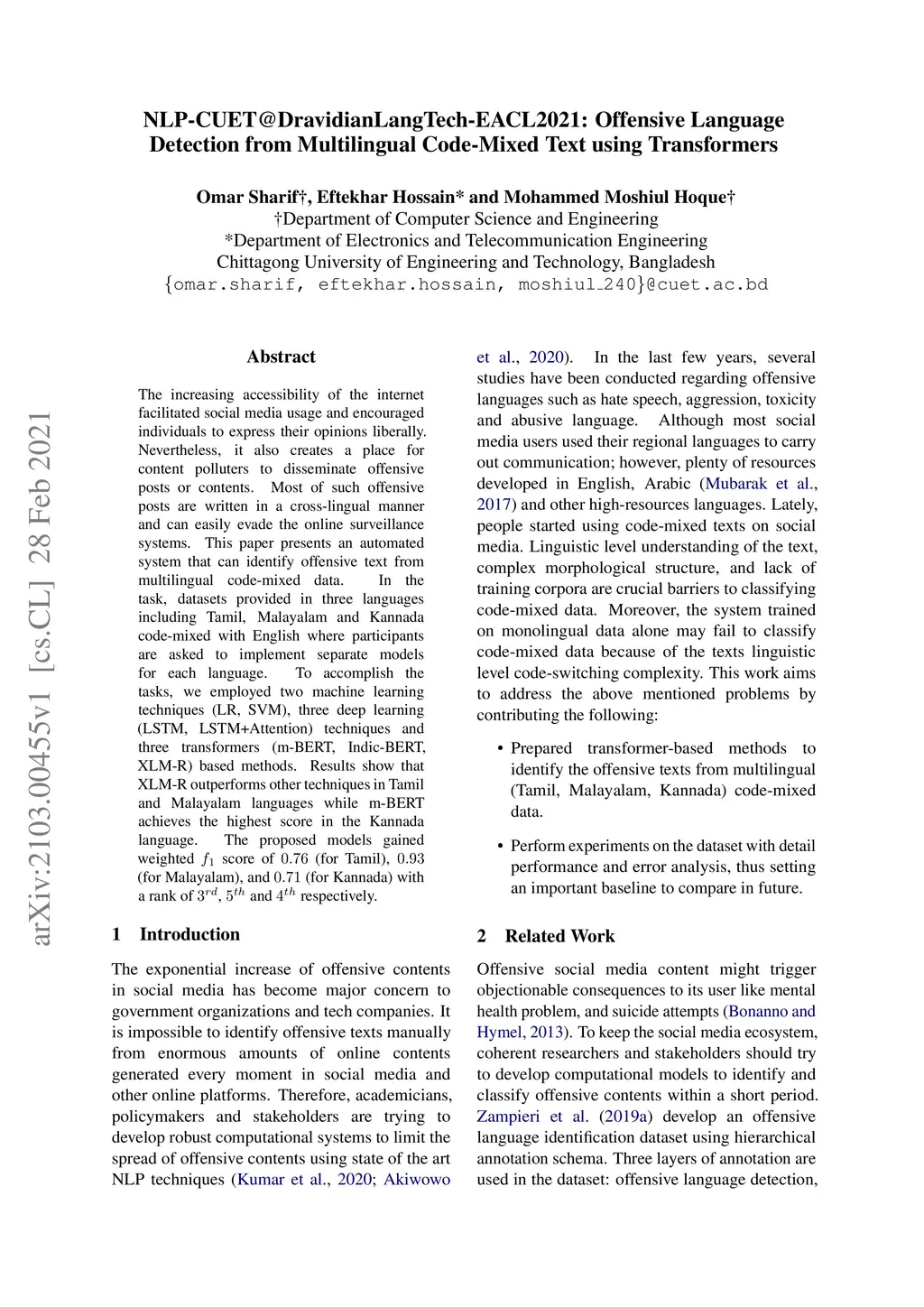 NLP-CUET@DravidianLangTech-EACL2021: Offensive Language Detection from