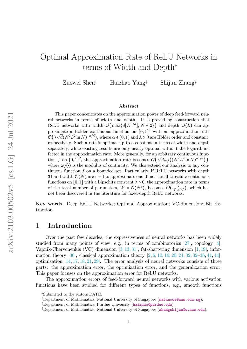 This paper concentrates on the approximation power of deep feed-forward neural networks in terms of width and depth. It is proved by construction that ReLU networks with width and depth can approximate a H\"older continuous function on with an approximation rate , where and are H\"older order and constant, respectively. Such a rate is optimal up to a constant in terms of width and depth separately, while existing results are only nearly optimal without the logarithmic factor in the approximation rate. More generally, for an arbitrary continuous function on , the approximation rate becomes , where is the modulus of continuity. We also extend our analysis to any continuous function on a bounded set. Particularly, if ReLU networks with depth and width are used to approximate one-dimensional Lipschitz continuous functions on with a Lipschitz constant , the approximation rate in terms of the total number of parameters, , becomes , which has not been discovered in the literature for fixed-depth ReLU networks.