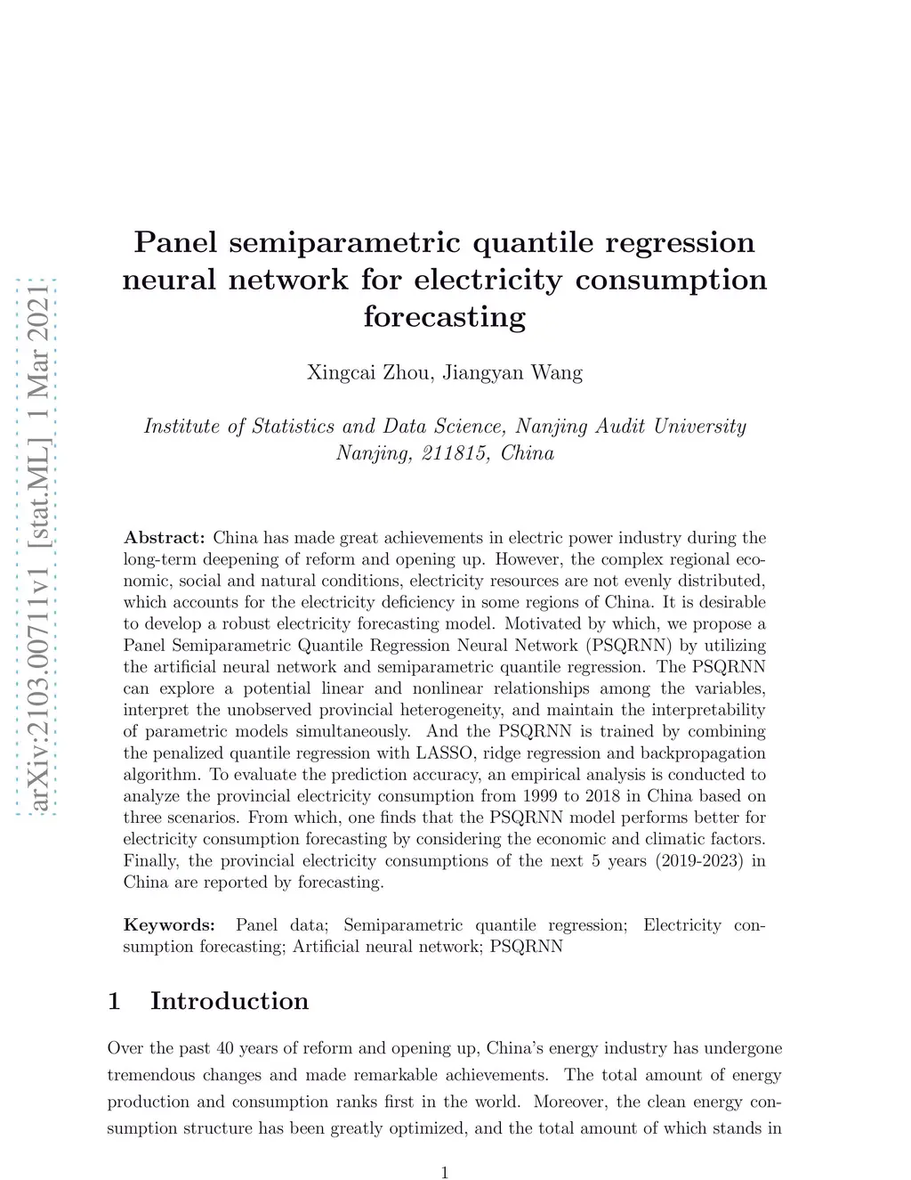 China has made great achievements in electric power industry during the long-term deepening of reform and opening up. However, the complex regional economic, social and natural conditions, electricity resources are not evenly distributed, which accounts for the electricity deficiency in some regions of China. It is desirable to develop a robust electricity forecasting model. Motivated by which, we propose a Panel Semiparametric Quantile Regression Neural Network (PSQRNN) by utilizing the artificial neural network and semiparametric quantile regression. The PSQRNN can explore a potential linear and nonlinear relationships among the variables, interpret the unobserved provincial heterogeneity, and maintain the interpretability of parametric models simultaneously. And the PSQRNN is trained by combining the penalized quantile regression with LASSO, ridge regression and backpropagation algorithm. To evaluate the prediction accuracy, an empirical analysis is conducted to analyze the provincial electricity consumption from 1999 to 2018 in China based on three scenarios. From which, one finds that the PSQRNN model performs better for electricity consumption forecasting by considering the economic and climatic factors. Finally, the provincial electricity consumptions of the next years (2019-2023) in China are reported by forecasting.