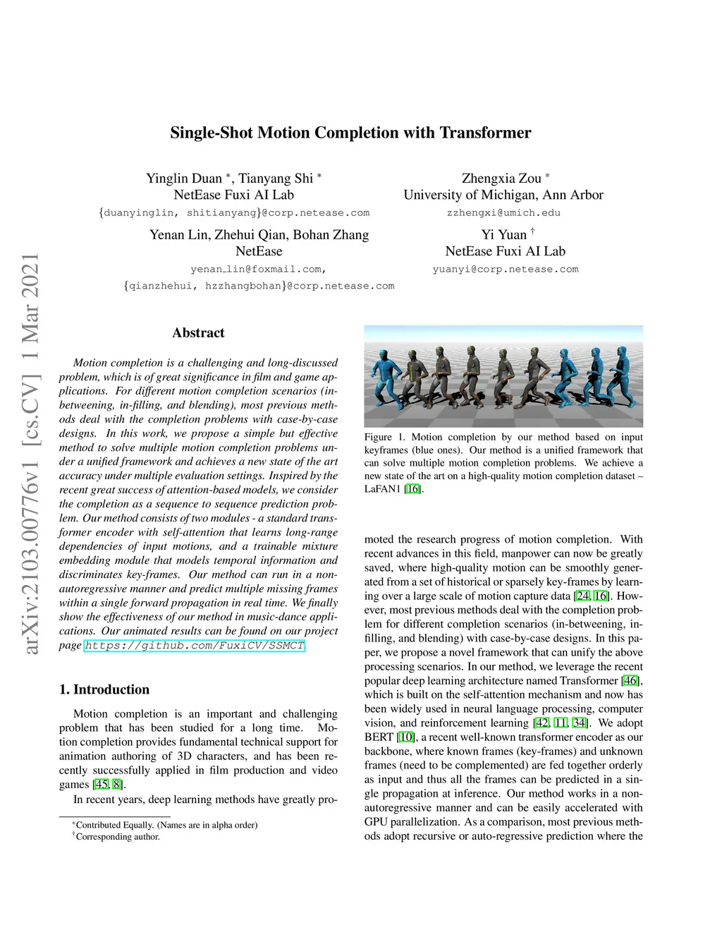Motion completion is a challenging and long-discussed problem, which is of great significance in film and game applications. For different motion completion scenarios (in-betweening, in-filling, and blending), most previous methods deal with the completion problems with case-by-case designs. In this work, we propose a simple but effective method to solve multiple motion completion problems under a unified framework and achieves a new state of the art accuracy under multiple evaluation settings. Inspired by the recent great success of attention-based models, we consider the completion as a sequence to sequence prediction problem. Our method consists of two modules - a standard transformer encoder with self-attention that learns long-range dependencies of input motions, and a trainable mixture embedding module that models temporal information and discriminates key-frames. Our method can run in a non-autoregressive manner and predict multiple missing frames within a single forward propagation in real time. We finally show the effectiveness of our method in music-dance applications.