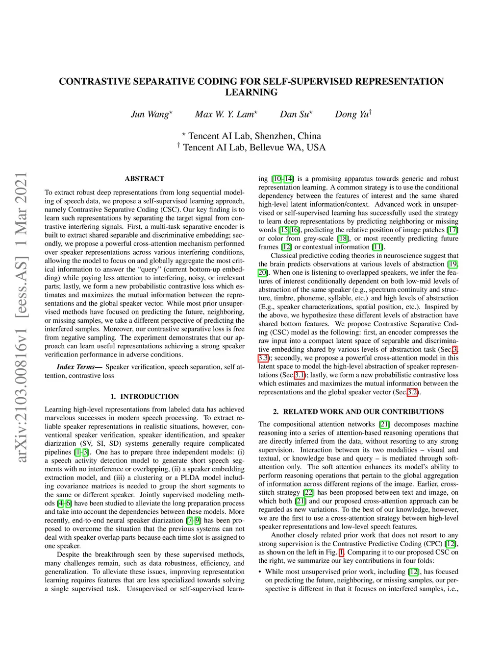 To extract robust deep representations from long sequential modeling of speech data, we propose a self-supervised learning approach, namely Contrastive Separative Coding (CSC). Our key finding is to learn such representations by separating the target signal from contrastive interfering signals. First, a multi-task separative encoder is built to extract shared separable and discriminative embedding; secondly, we propose a powerful cross-attention mechanism performed over speaker representations across various interfering conditions, allowing the model to focus on and globally aggregate the most critical information to answer the "query" (current bottom-up embedding) while paying less attention to interfering, noisy, or irrelevant parts; lastly, we form a new probabilistic contrastive loss which estimates and maximizes the mutual information between the representations and the global speaker vector. While most prior unsupervised methods have focused on predicting the future, neighboring, or missing samples, we take a different perspective of predicting the interfered samples. Moreover, our contrastive separative loss is free from negative sampling. The experiment demonstrates that our approach can learn useful representations achieving a strong speaker verification performance in adverse conditions.