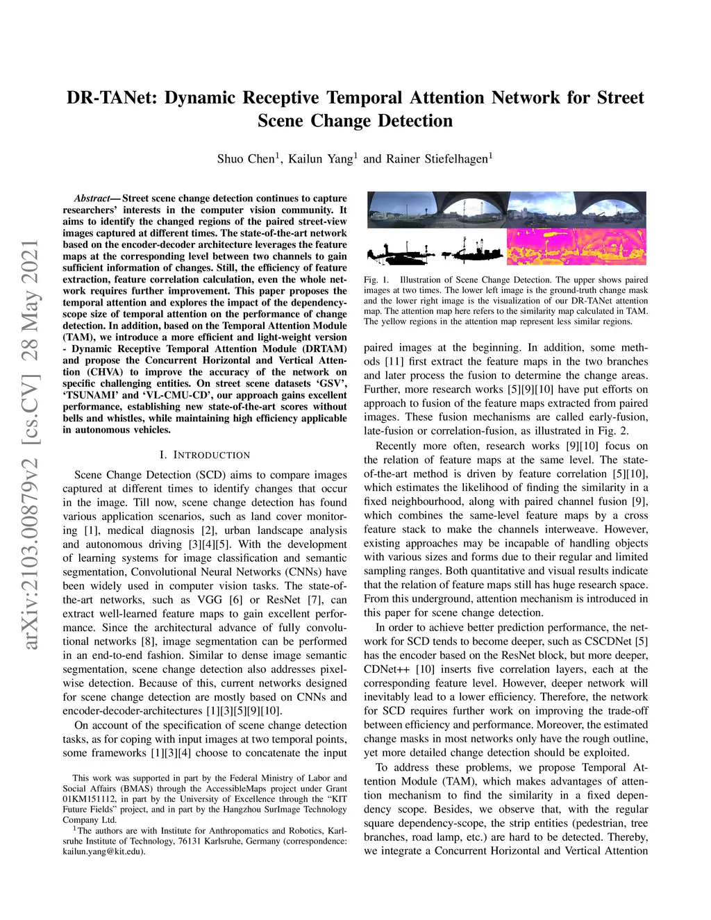 Street scene change detection continues to capture researchers' interests in the computer vision community. It aims to identify the changed regions of the paired street-view images captured at different times. The state-of-the-art network based on the encoder-decoder architecture leverages the feature maps at the corresponding level between two channels to gain sufficient information of changes. Still, the efficiency of feature extraction, feature correlation calculation, even the whole network requires further improvement. This paper proposes the temporal attention and explores the impact of the dependency-scope size of temporal attention on the performance of change detection. In addition, based on the Temporal Attention Module (TAM), we introduce a more efficient and light-weight version - Dynamic Receptive Temporal Attention Module (DRTAM) and propose the Concurrent Horizontal and Vertical Attention (CHVA) to improve the accuracy of the network on specific challenging entities. On street scene datasets `GSV', `TSUNAMI' and `VL-CMU-CD', our approach gains excellent performance, establishing new state-of-the-art scores without bells and whistles, while maintaining high efficiency applicable in autonomous vehicles.