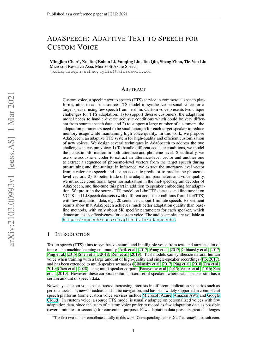 Custom voice, a specific text to speech (TTS) service in commercial speech platforms, aims to adapt a source TTS model to synthesize personal voice for a target speaker using few speech data. Custom voice presents two unique challenges for TTS adaptation: 1) to support diverse customers, the adaptation model needs to handle diverse acoustic conditions that could be very different from source speech data, and 2) to support a large number of customers, the adaptation parameters need to be small enough for each target speaker to reduce memory usage while maintaining high voice quality. In this work, we propose AdaSpeech, an adaptive TTS system for high-quality and efficient customization of new voices. We design several techniques in AdaSpeech to address the two challenges in custom voice: 1) To handle different acoustic conditions, we use two acoustic encoders to extract an utterance-level vector and a sequence of phoneme-level vectors from the target speech during training; in inference, we extract the utterance-level vector from a reference speech and use an acoustic predictor to predict the phoneme-level vectors. 2) To better trade off the adaptation parameters and voice quality, we introduce conditional layer normalization in the mel-spectrogram decoder of AdaSpeech, and fine-tune this part in addition to speaker embedding for adaptation. We pre-train the source TTS model on LibriTTS datasets and fine-tune it on VCTK and LJSpeech datasets (with different acoustic conditions from LibriTTS) with few adaptation data, e.g., 20 sentences, about 1 minute speech. Experiment results show that AdaSpeech achieves much better adaptation quality than baseline methods, with only about 5K specific parameters for each speaker, which demonstrates its effectiveness for custom voice. Audio samples are available at https://speechresearch.github.io/adaspeech/.