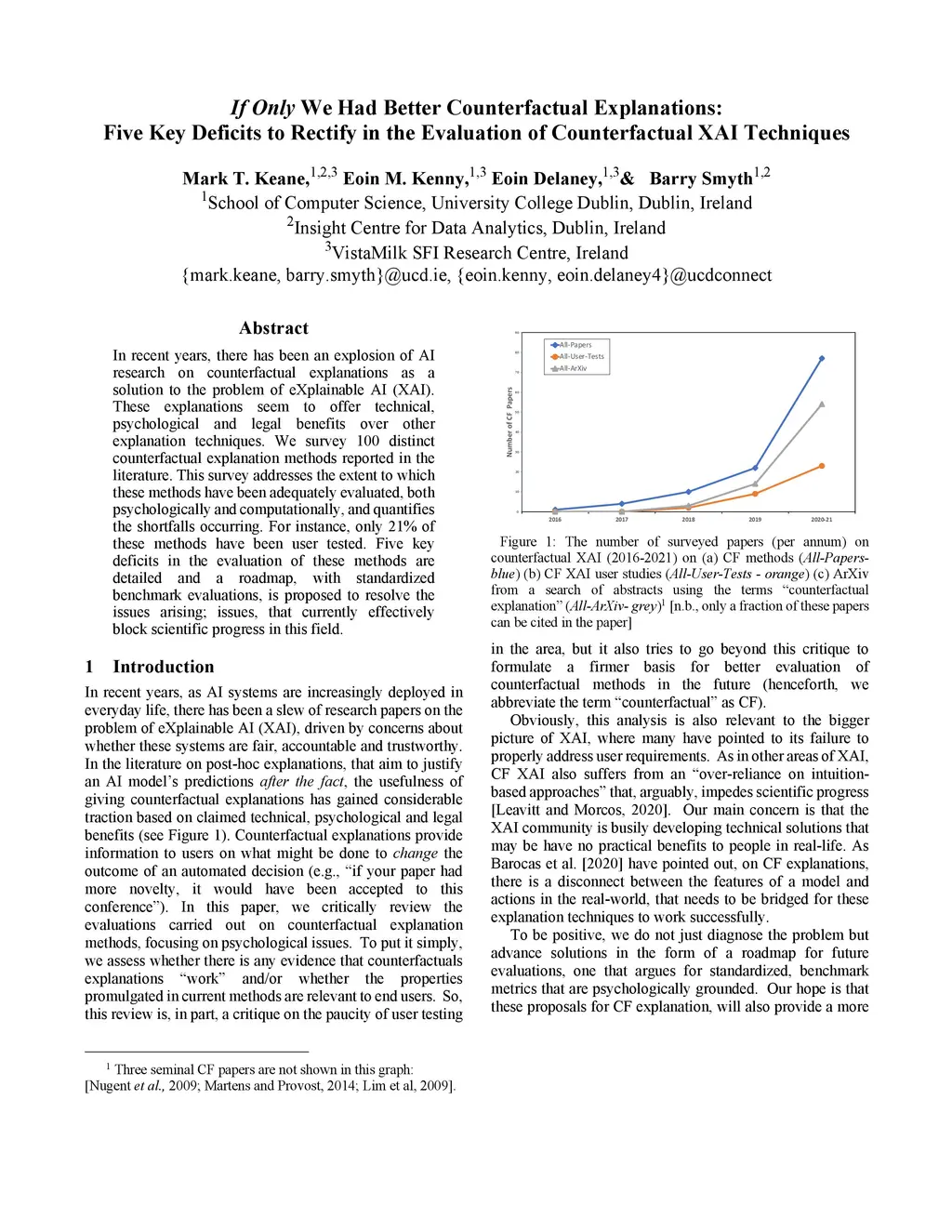 In recent years, there has been an explosion of AI research on counterfactual explanations as a solution to the problem of eXplainable AI (XAI). These explanations seem to offer technical, psychological and legal benefits over other explanation techniques. We survey 100 distinct counterfactual explanation methods reported in the literature. This survey addresses the extent to which these methods have been adequately evaluated, both psychologically and computationally, and quantifies the shortfalls occurring. For instance, only 21% of these methods have been user tested. Five key deficits in the evaluation of these methods are detailed and a roadmap, with standardised benchmark evaluations, is proposed to resolve the issues arising; issues, that currently effectively block scientific progress in this field.