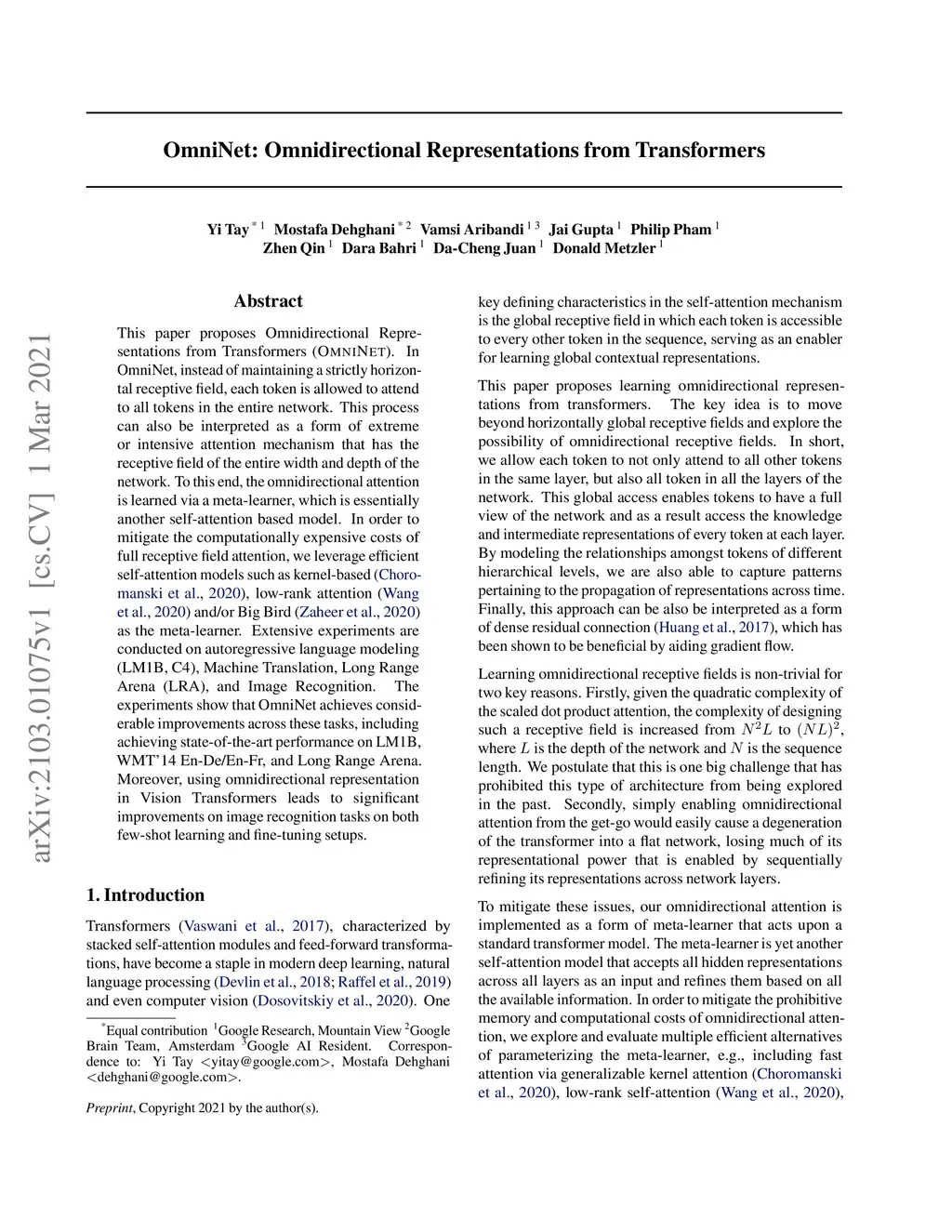 This paper proposes Omnidirectional Representations from Transformers (OmniNet). In OmniNet, instead of maintaining a strictly horizontal receptive field, each token is allowed to attend to all tokens in the entire network. This process can also be interpreted as a form of extreme or intensive attention mechanism that has the receptive field of the entire width and depth of the network. To this end, the omnidirectional attention is learned via a meta-learner, which is essentially another self-attention based model. In order to mitigate the computationally expensive costs of full receptive field attention, we leverage efficient self-attention models such as kernel-based (Choromanski et al.), low-rank attention (Wang et al.) and/or Big Bird (Zaheer et al.) as the meta-learner. Extensive experiments are conducted on autoregressive language modeling (LM1B, C4), Machine Translation, Long Range Arena (LRA), and Image Recognition. The experiments show that OmniNet achieves considerable improvements across these tasks, including achieving state-of-the-art performance on LM1B, WMT'14 En-De/En-Fr, and Long Range Arena. Moreover, using omnidirectional representation in Vision Transformers leads to significant improvements on image recognition tasks on both few-shot learning and fine-tuning setups.