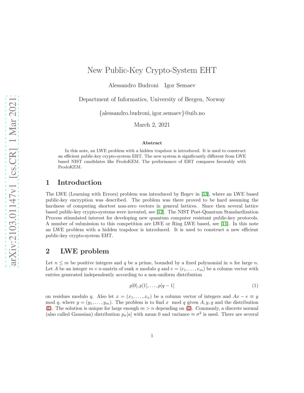 In this note, an LWE problem with a hidden trapdoor is introduced. It is used to construct an efficient public-key crypto-system EHT. The new system is significantly different from LWE based NIST candidates like FrodoKEM. The performance of EHT compares favorably with FrodoKEM.